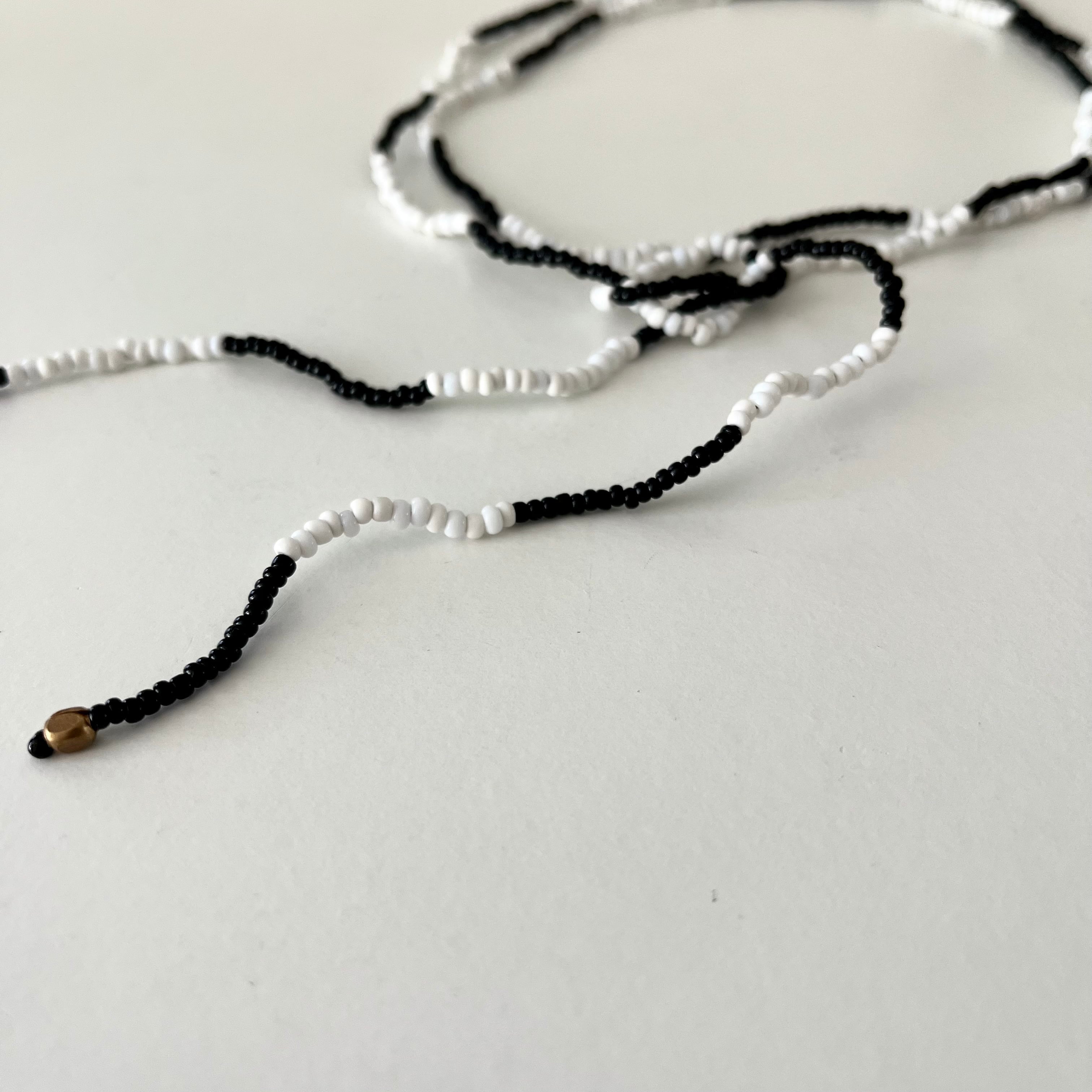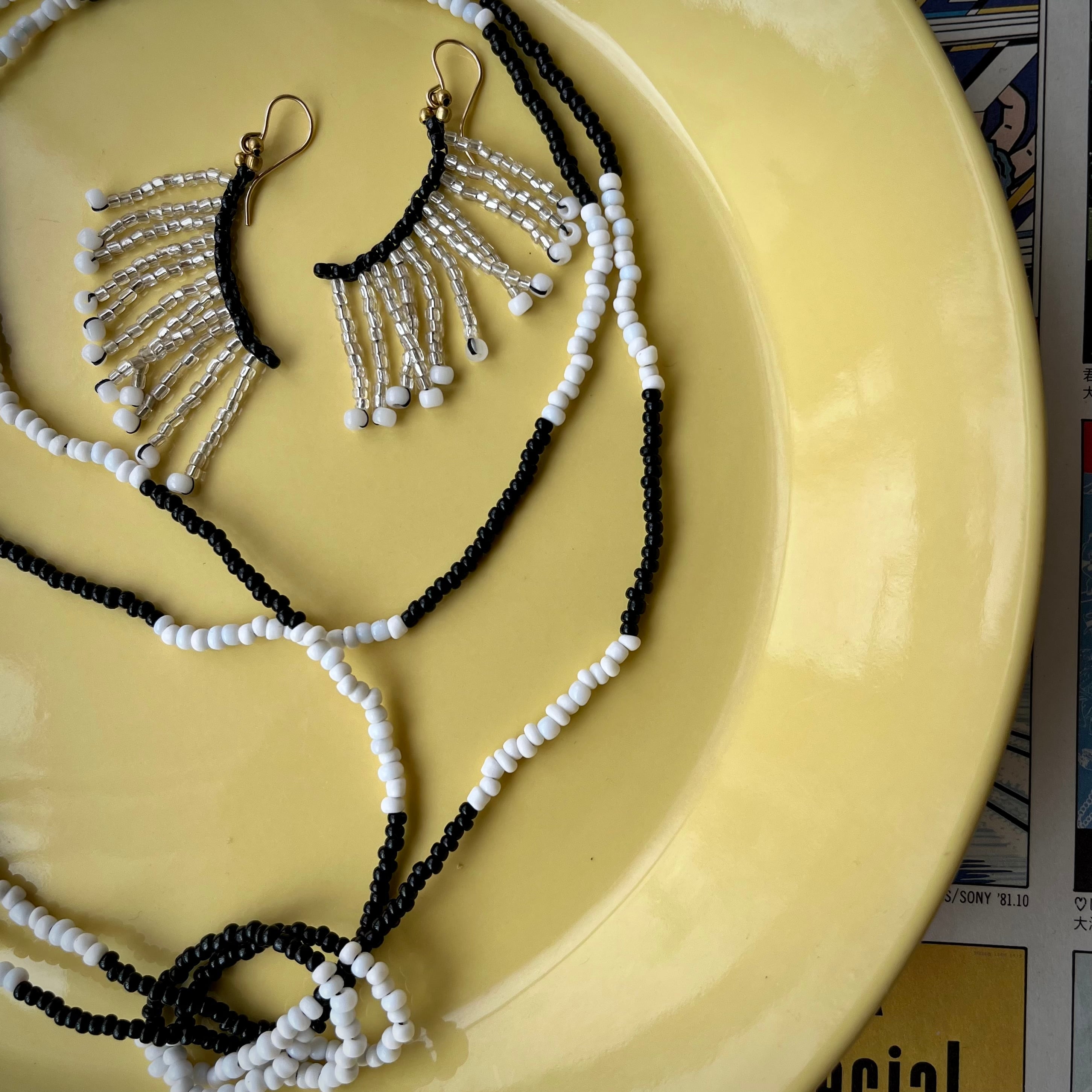 白黒のビーズを幅広に交互に配置してインパクトのあるネックレスにしました。
