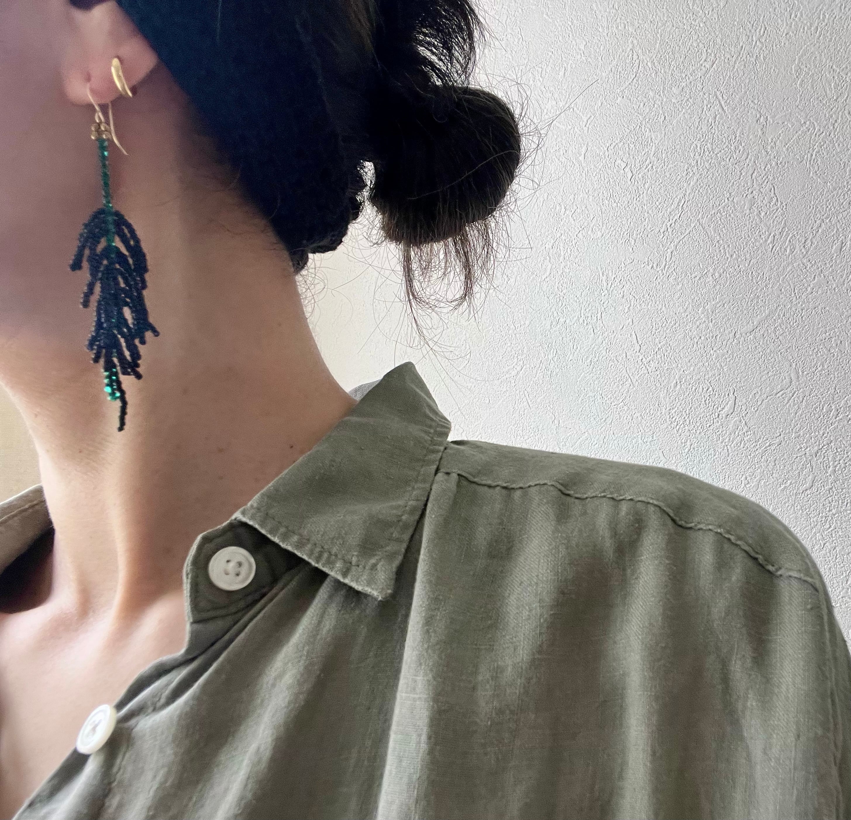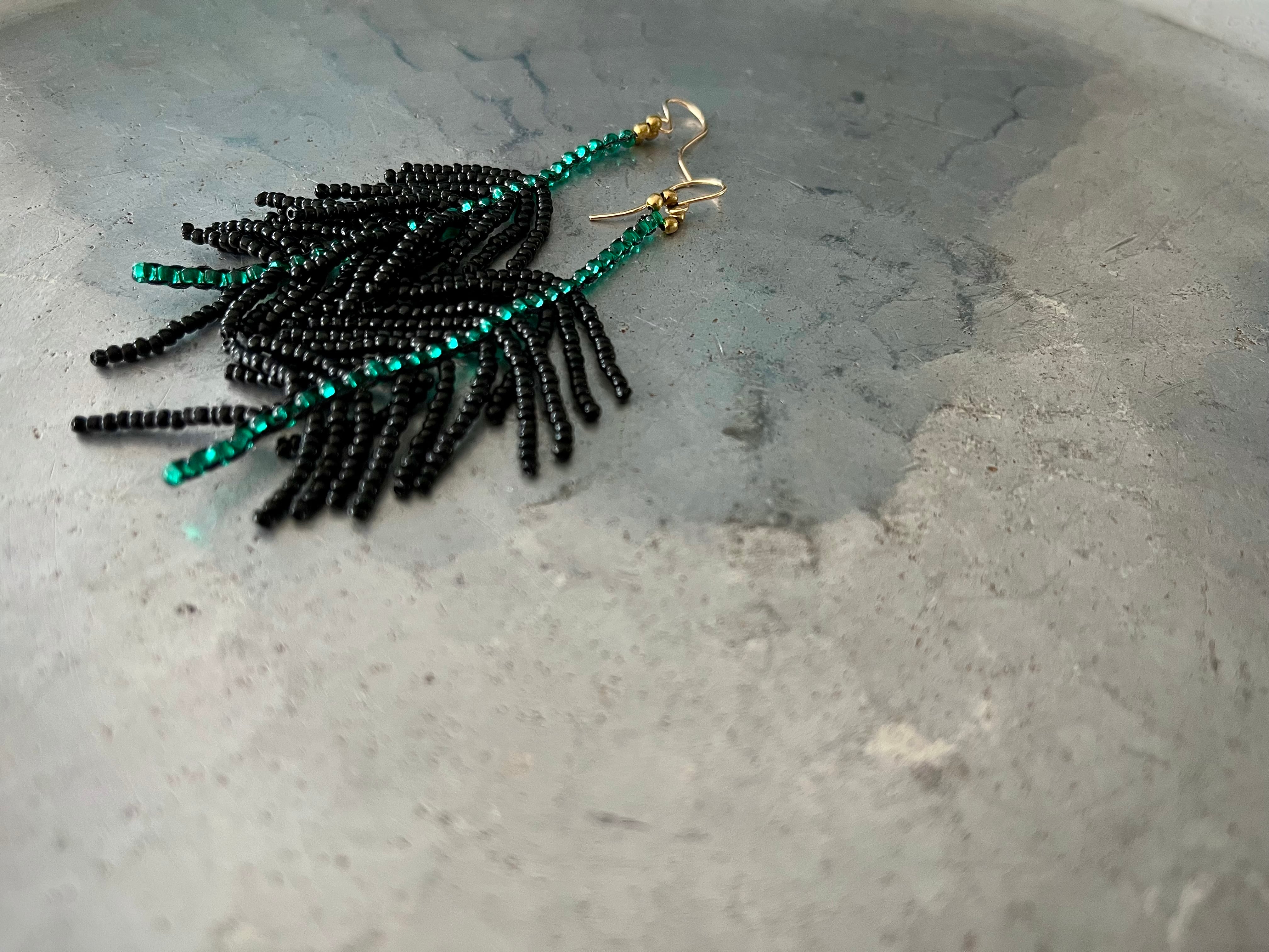黒ビーズがフサフサと耳元で揺れ、個性的でエッジがある印象のピアス。