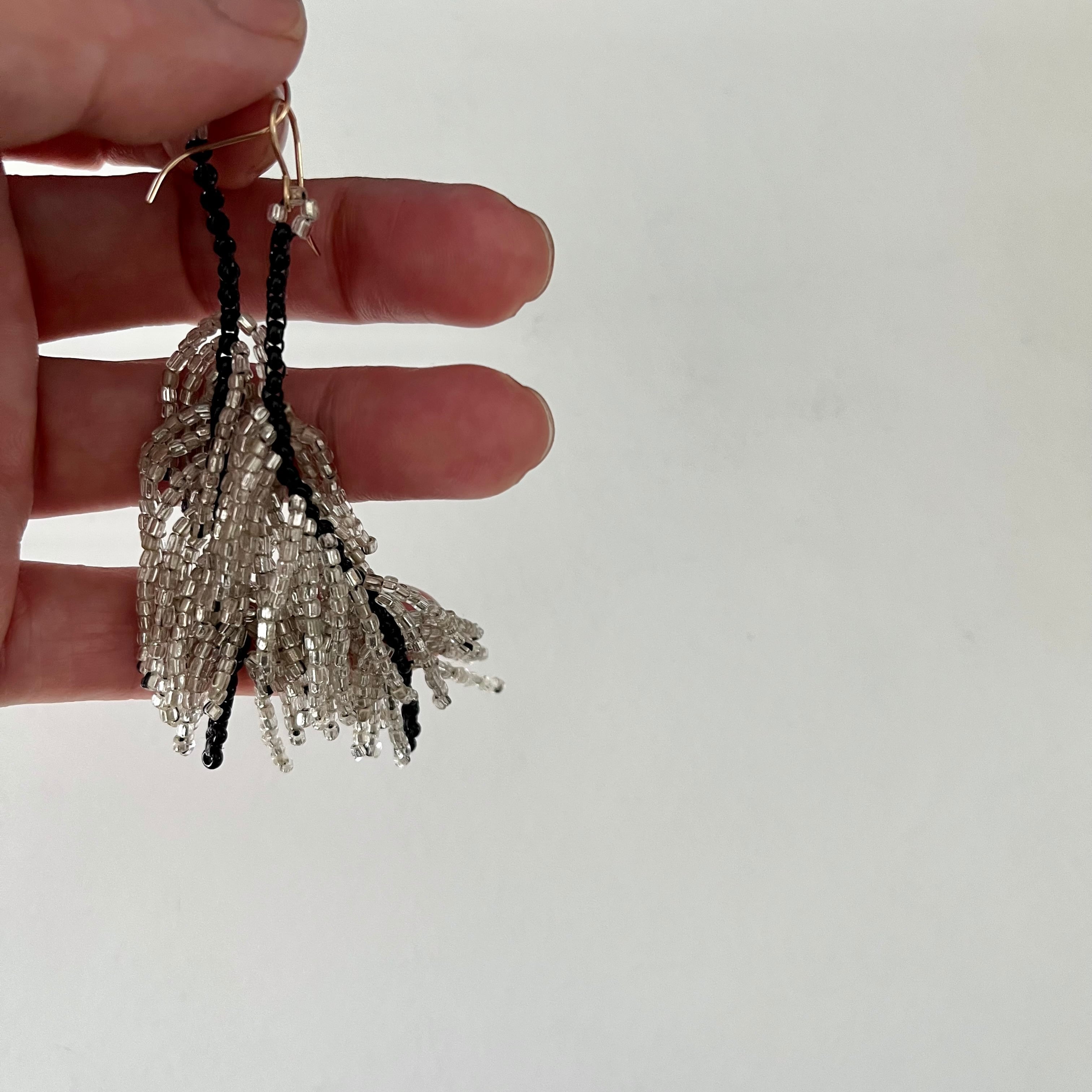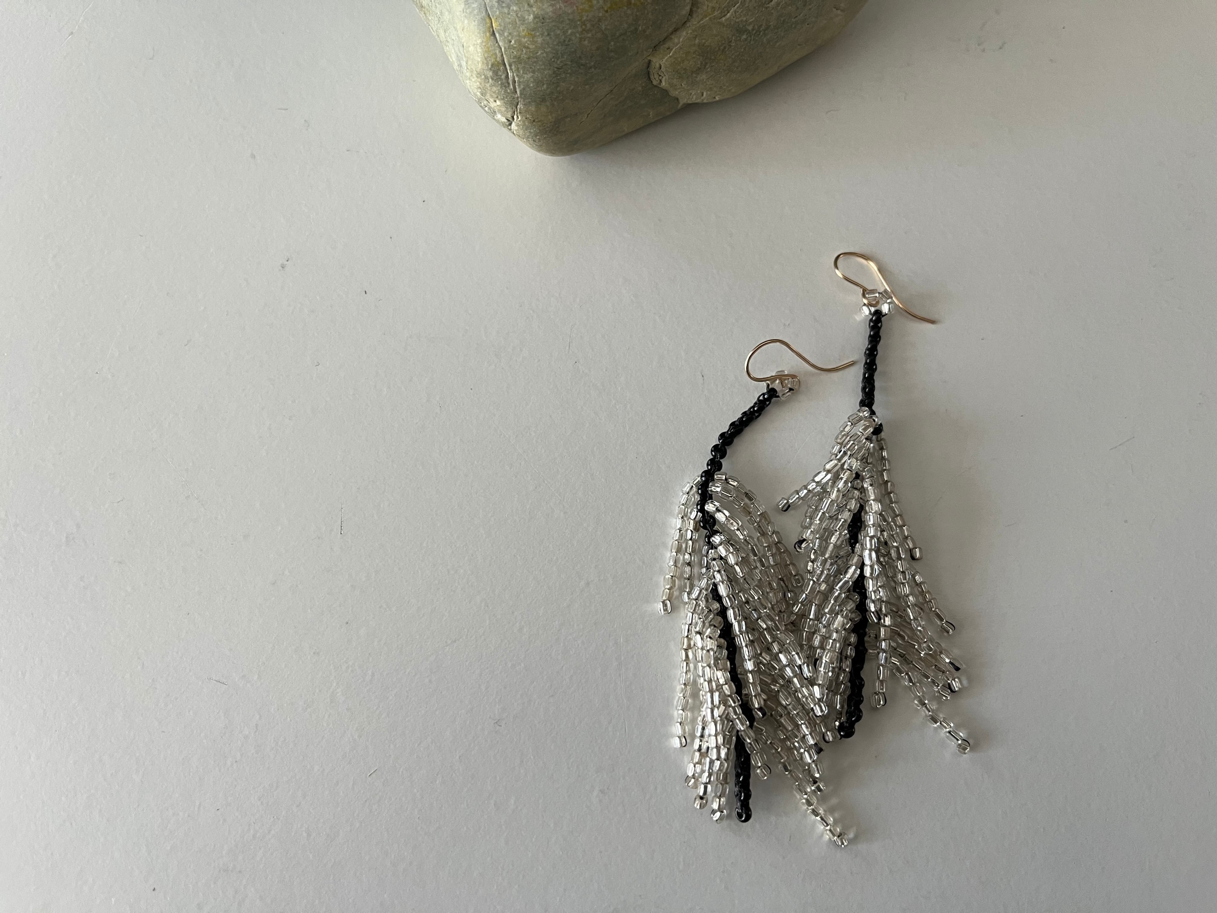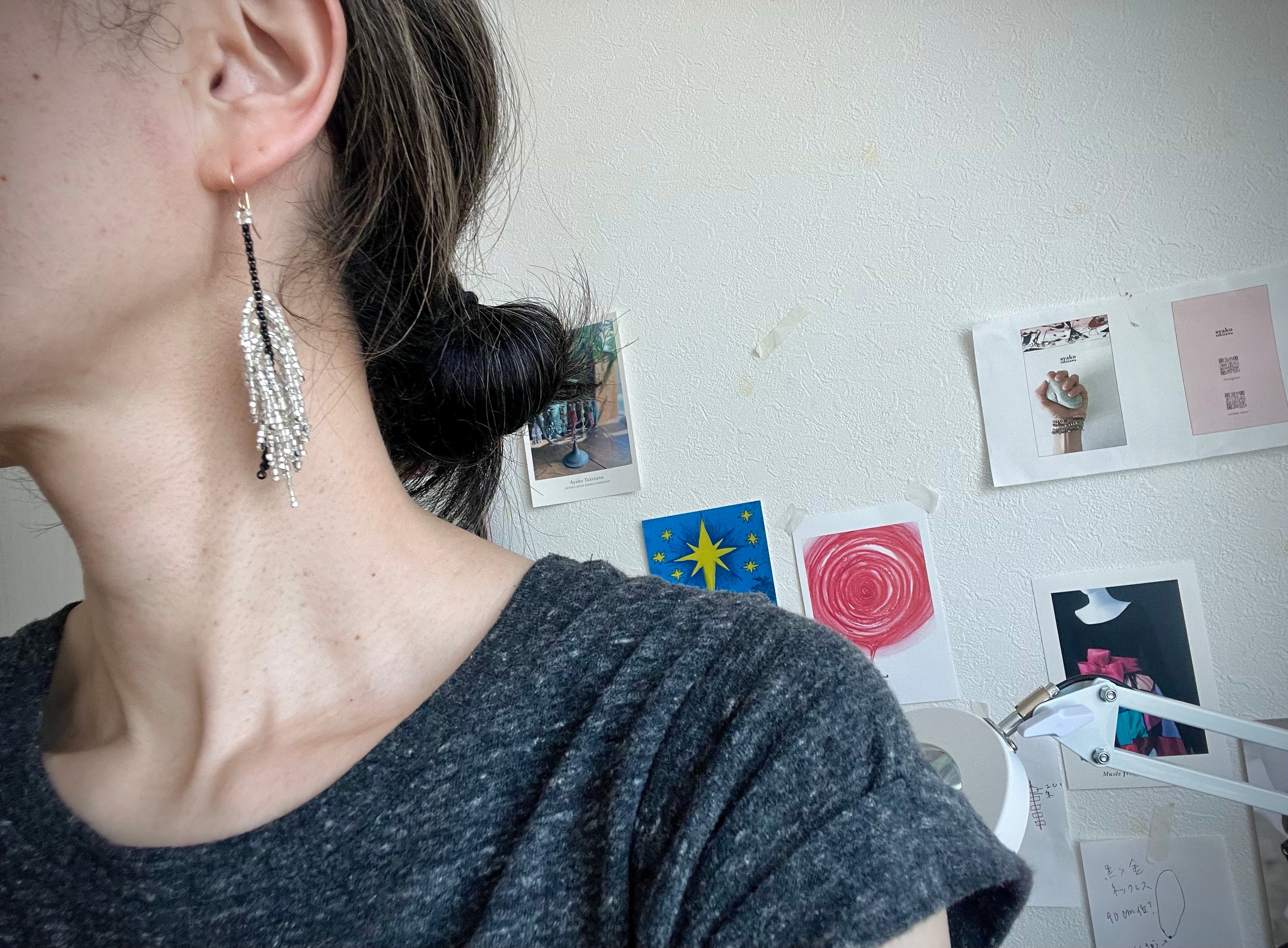 シルバービーズがフサフサと耳元で揺れ、個性的でエッジのあるピアスです。