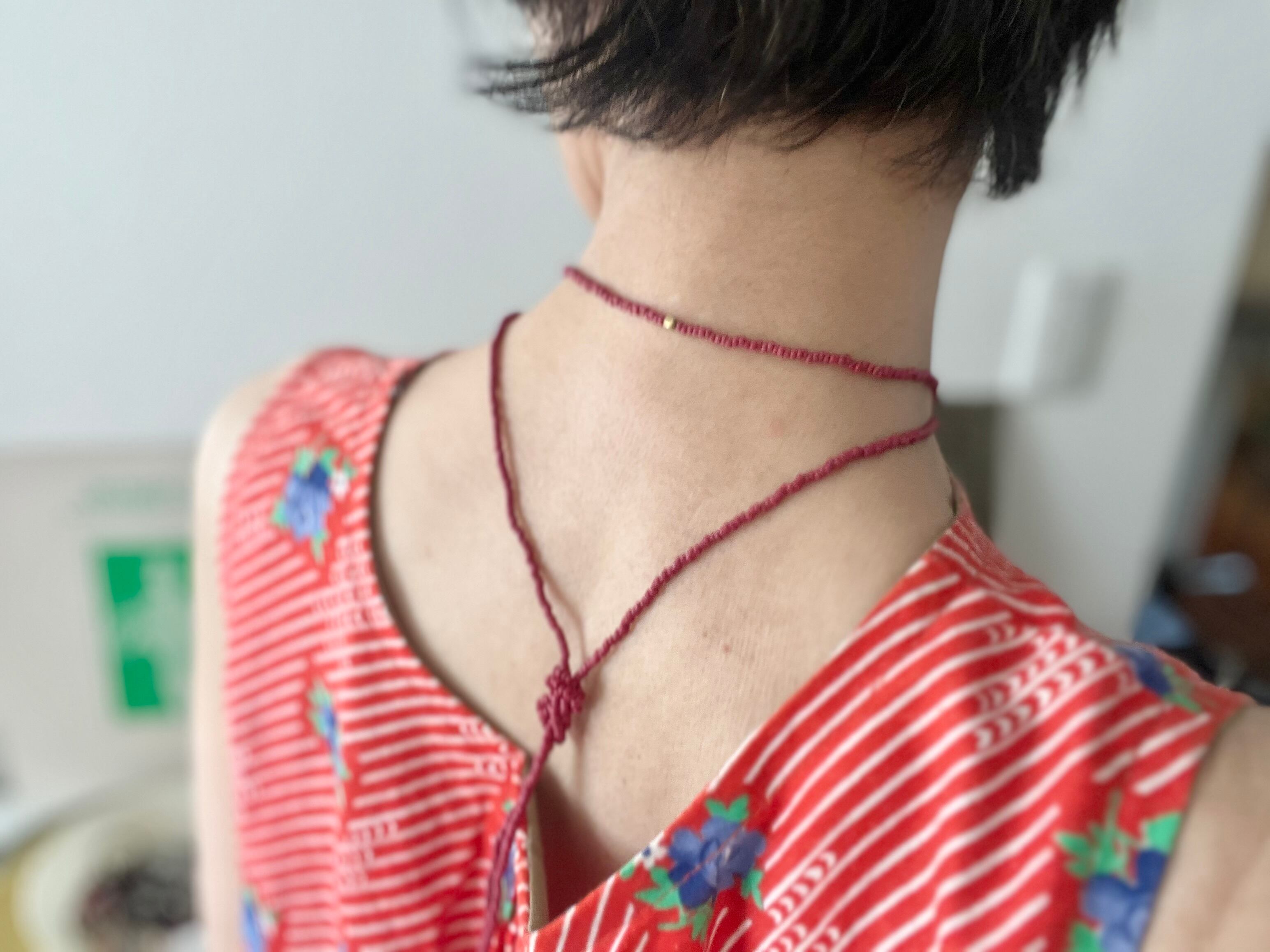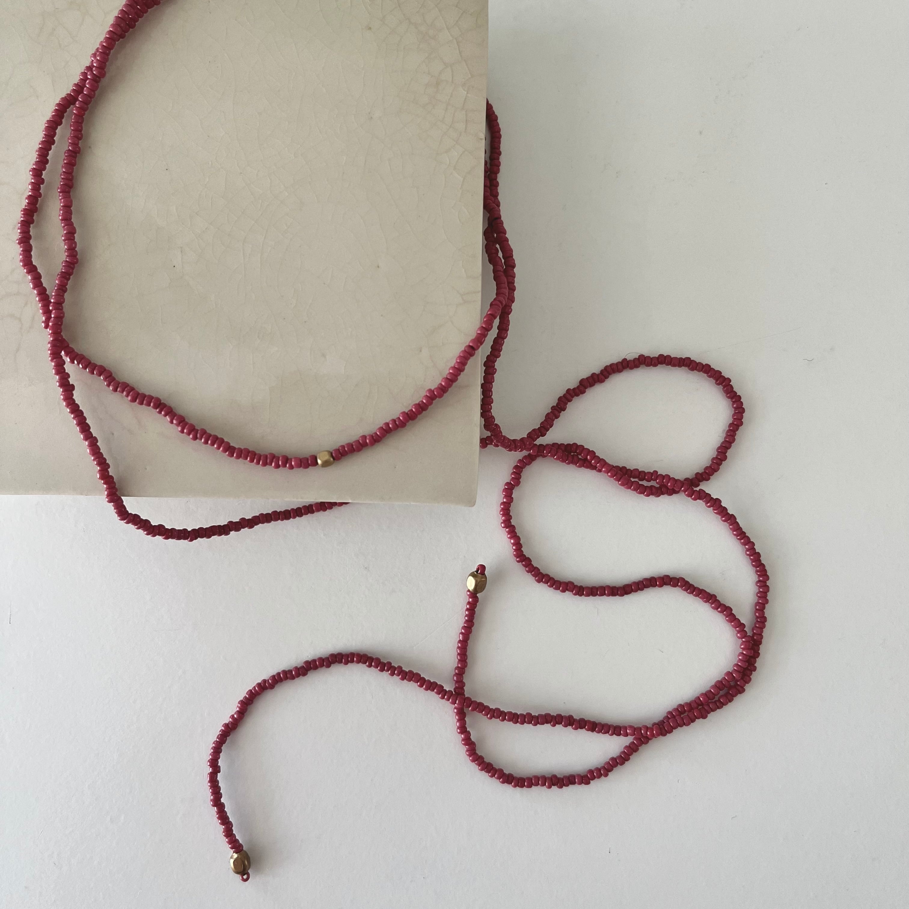 赤とピンクの中間のどことなくアーシーな雰囲気のビーズが連なる紐状のシンプルなネックレス。