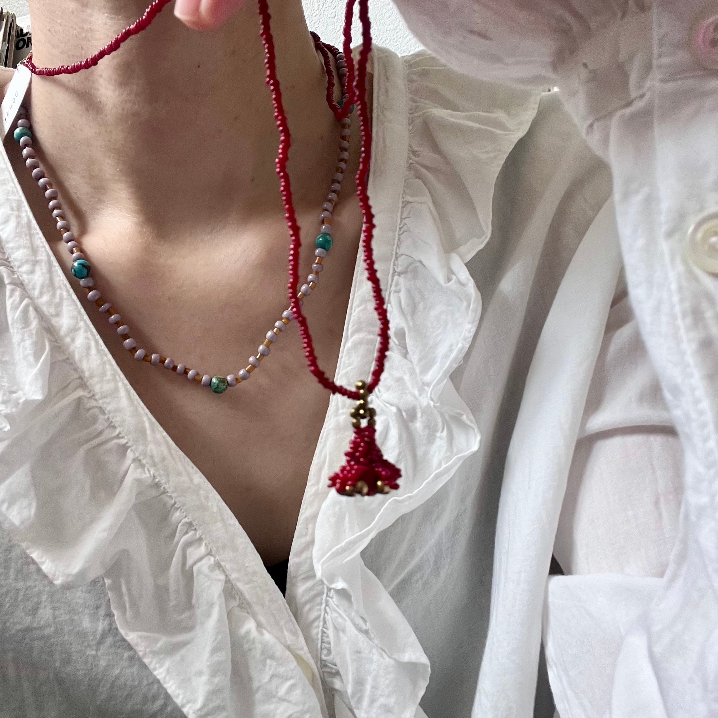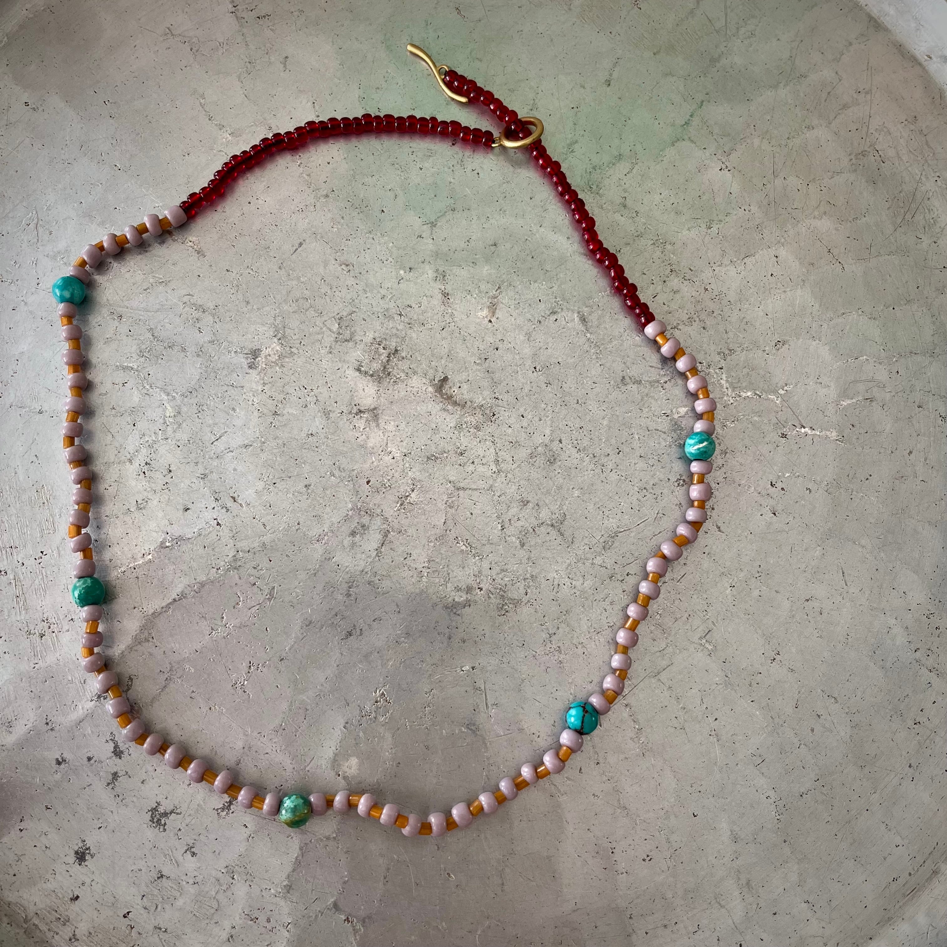 ターコイズにラベンダーカラーのビーズを組み合わせることで爽やか過ぎないシックなニュアンスのネックレスになりました。