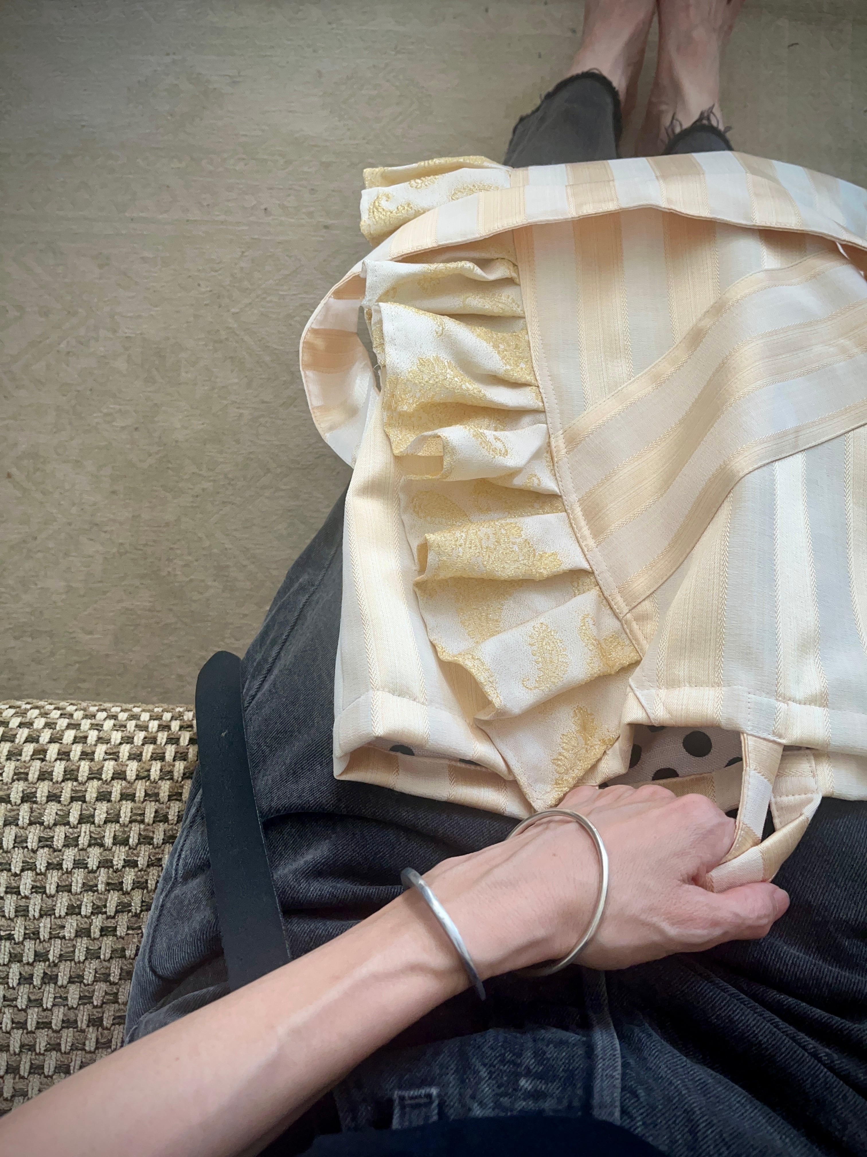 本体のゴールドストライプ生地、フリル部分のゴールド刺繍生地、共に派手過ぎず上品な輝き。