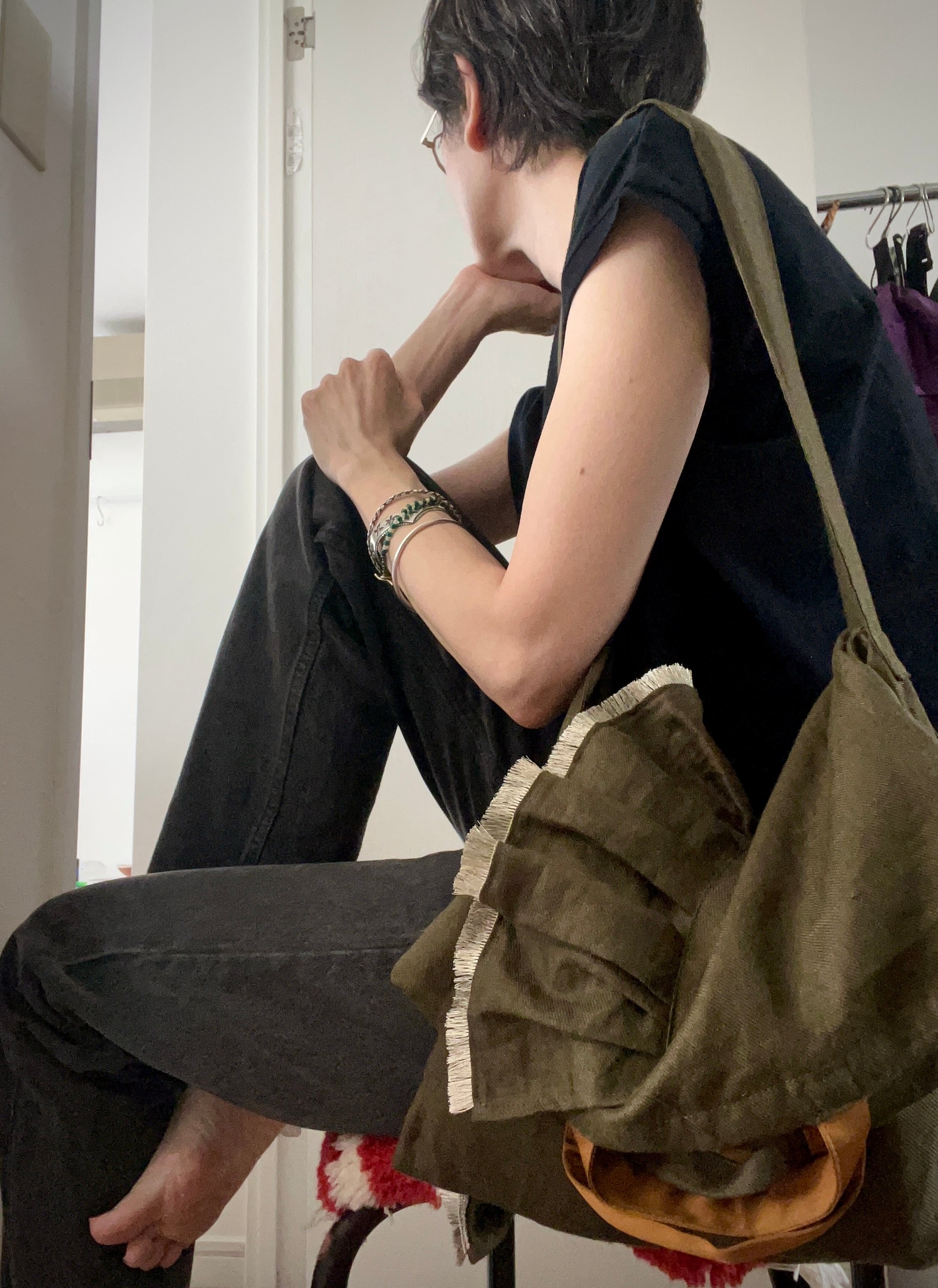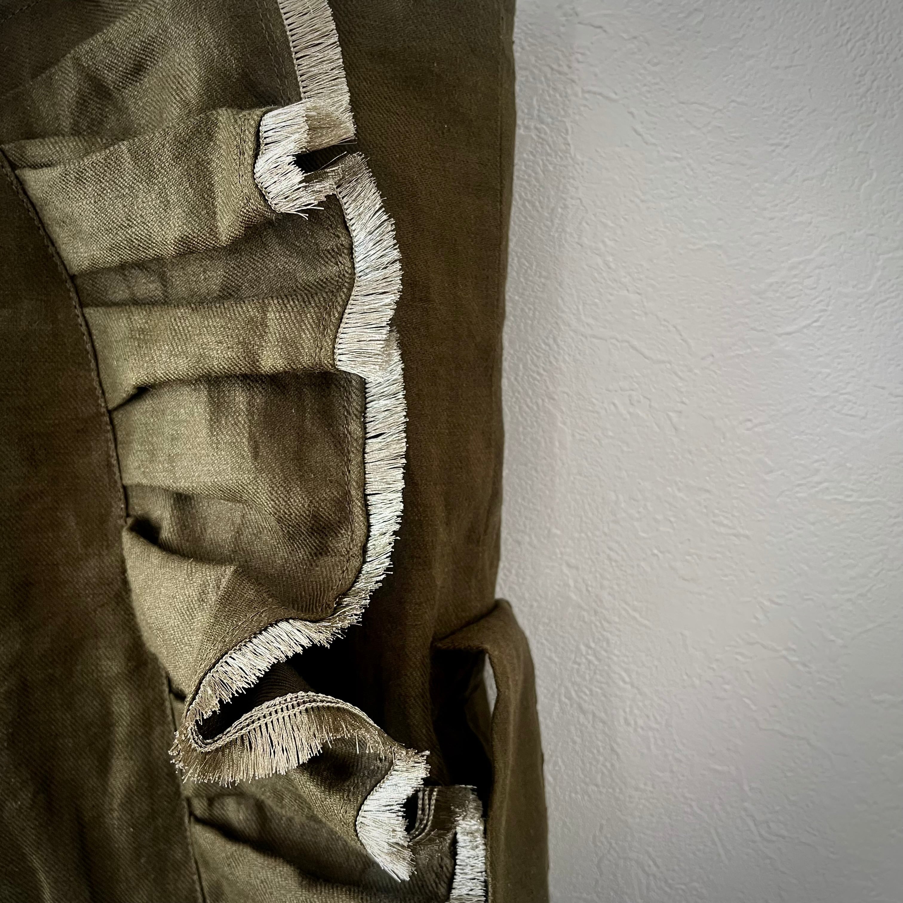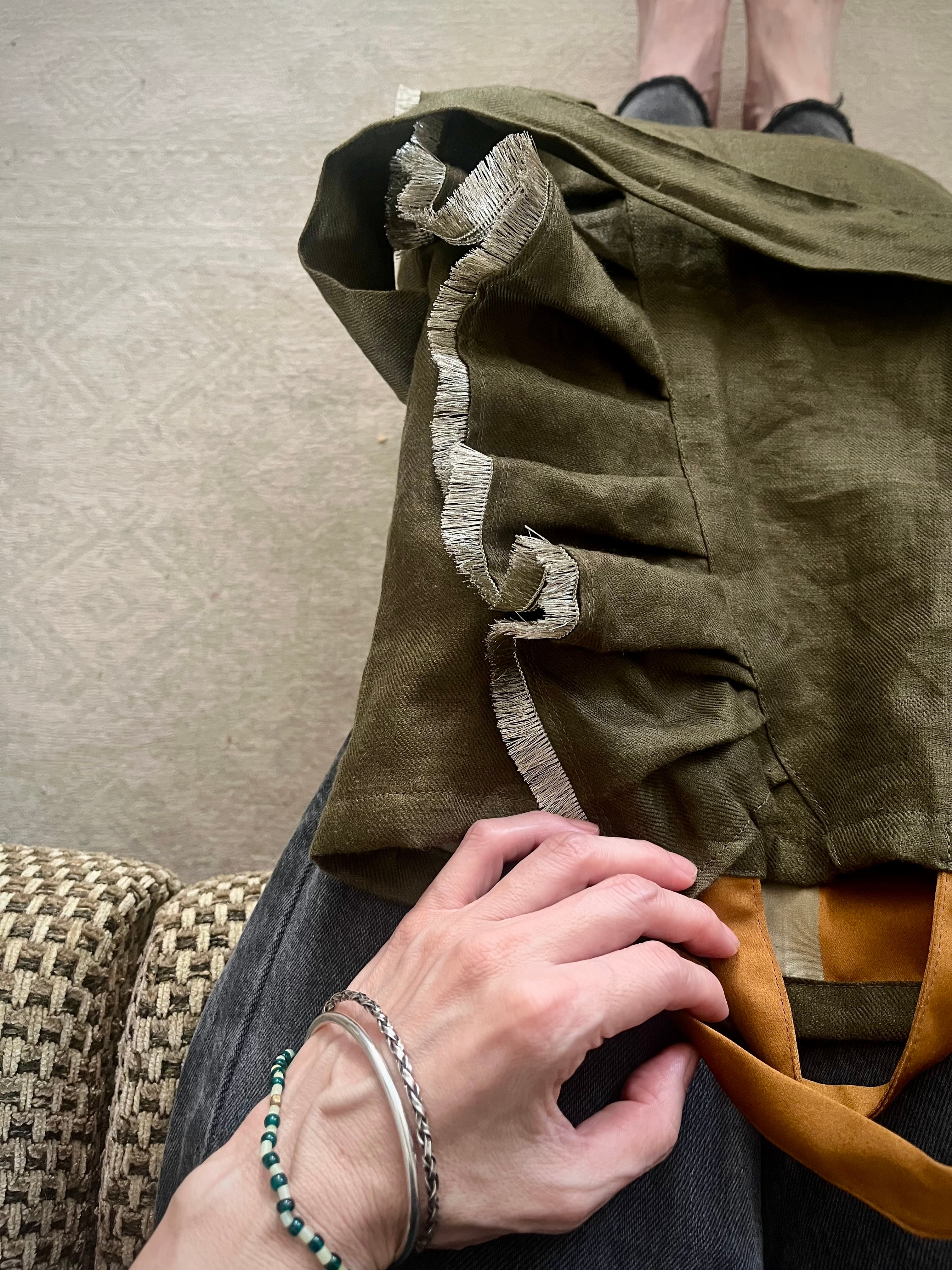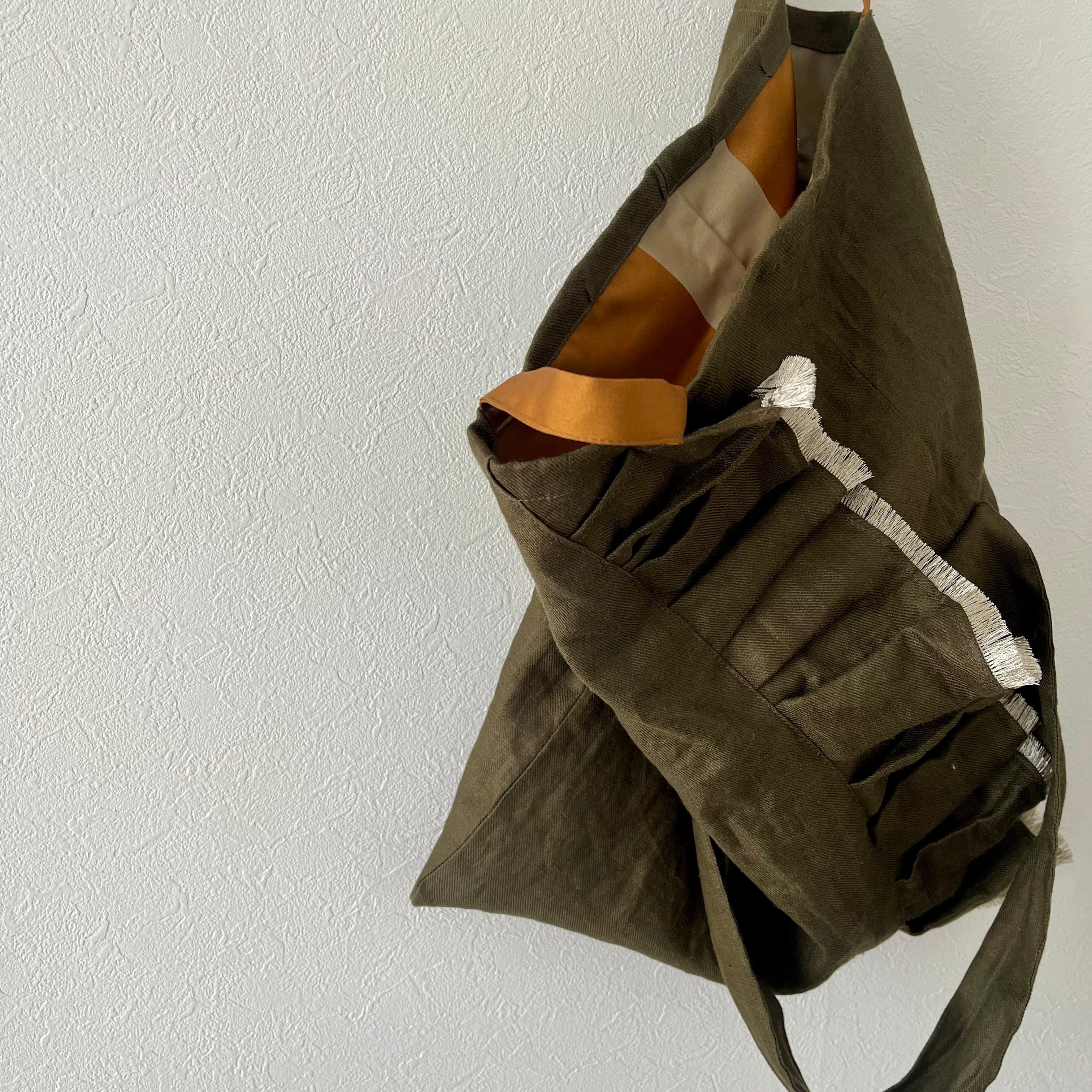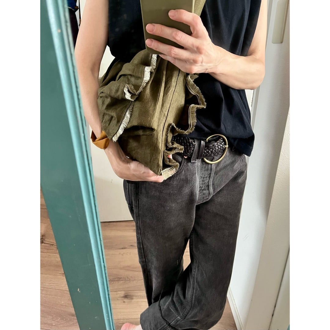 光沢のあるダークオリーブグリーンのリネン生地は柔らかな風合いで、くたっとする様子に愛着が湧きます。
