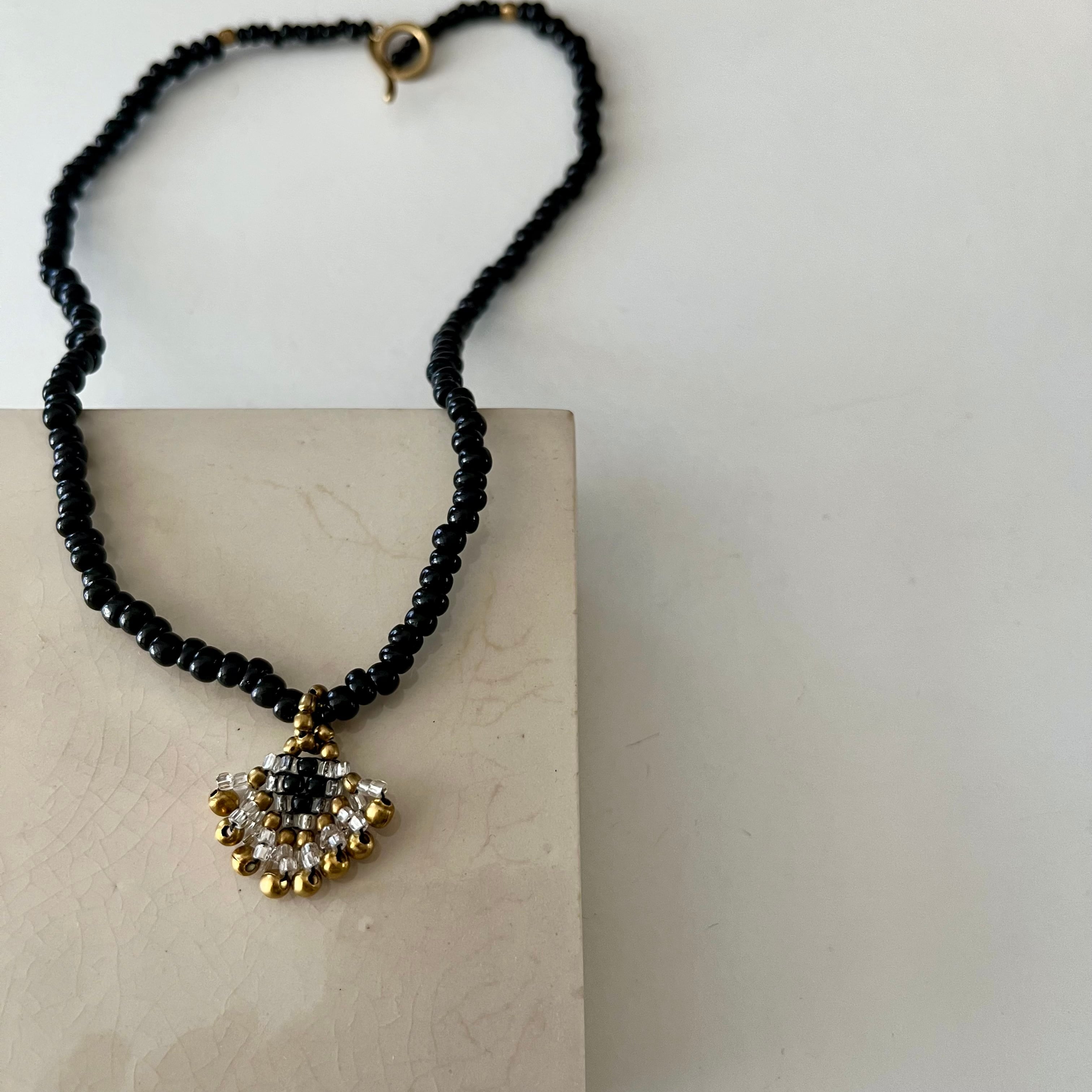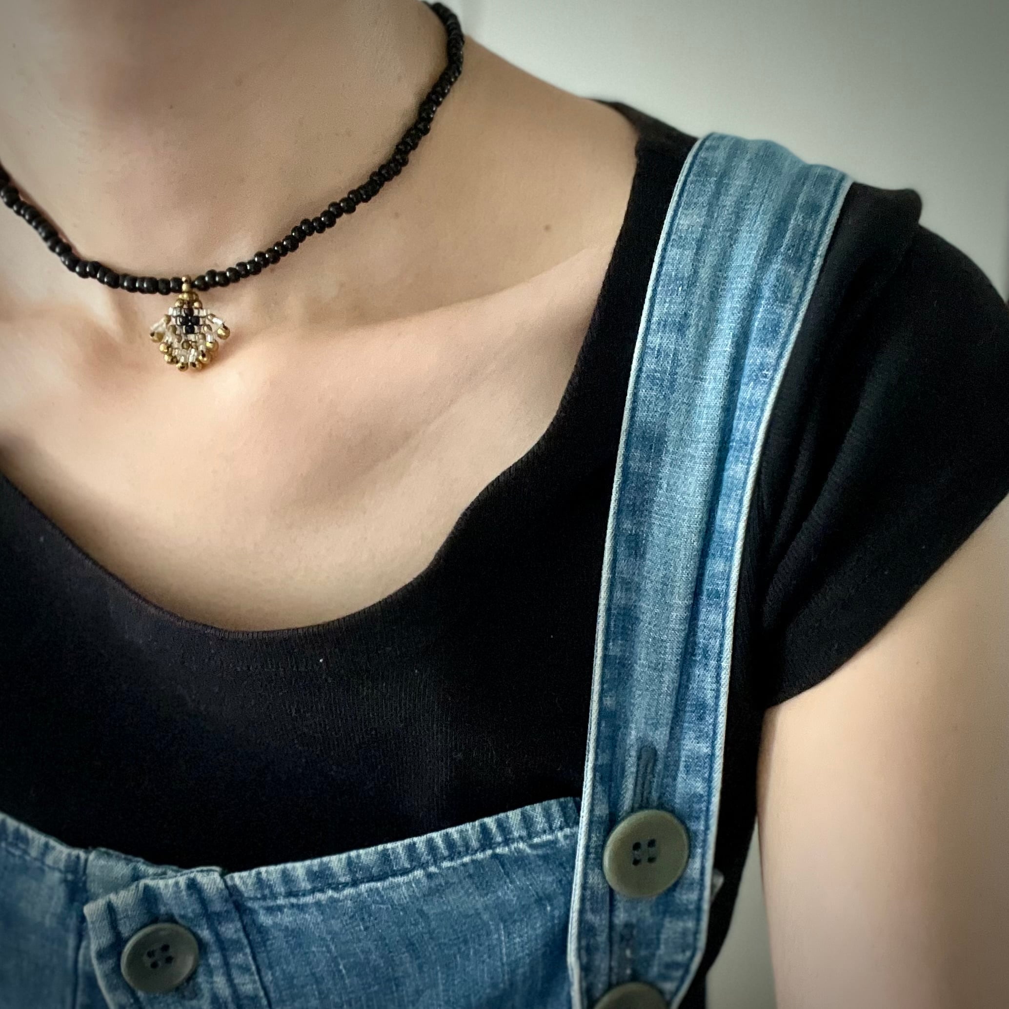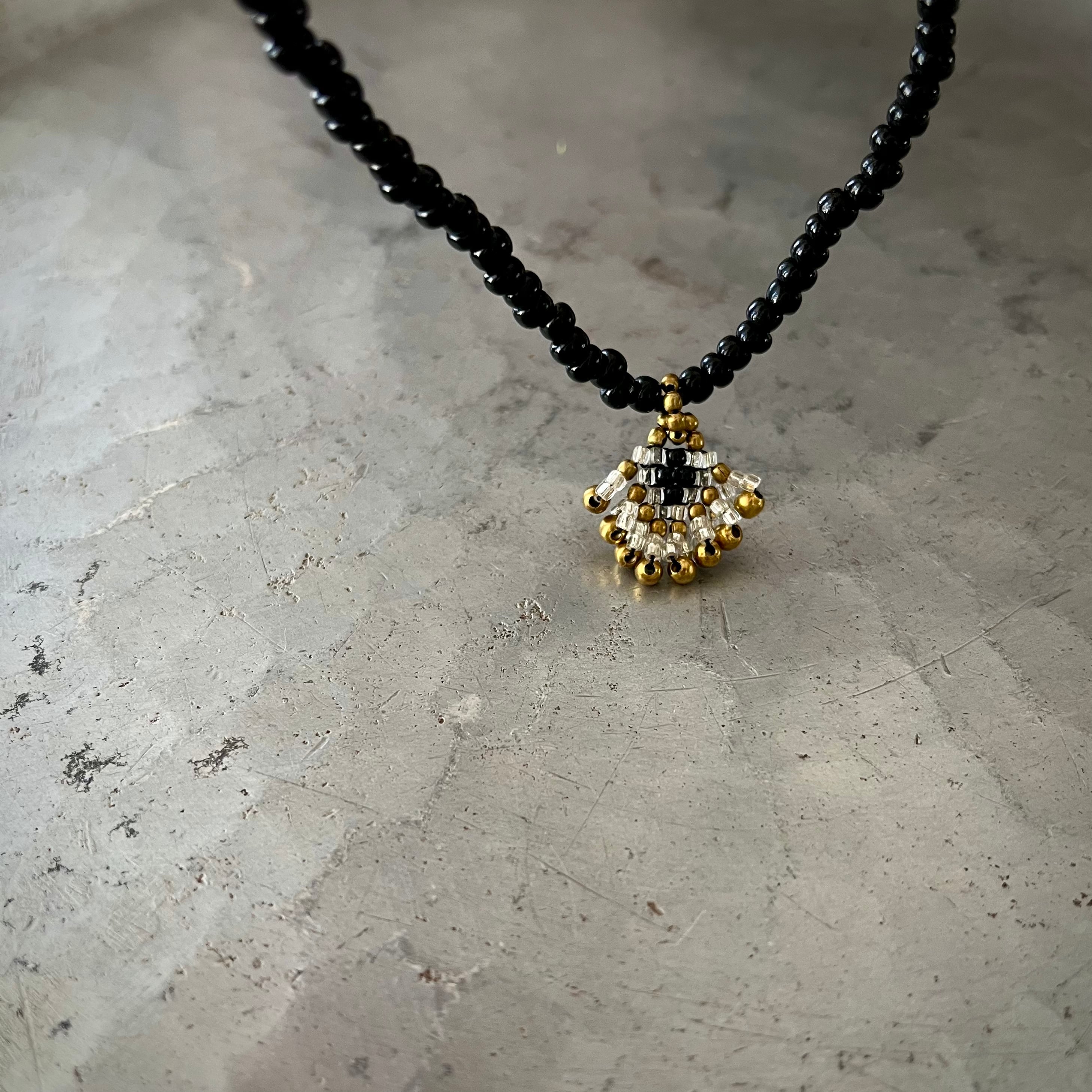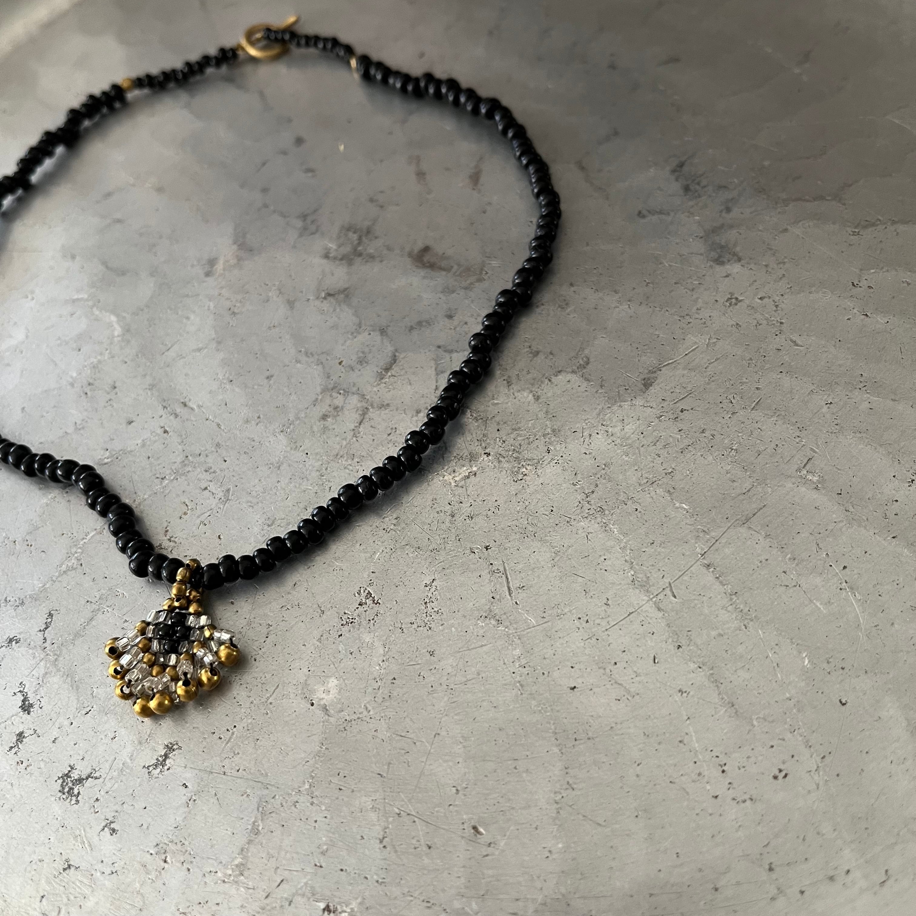 コロンとした黒ビーズは一粒一粒形が異なり、鈍い輝きが古いビーズならではの雰囲気。