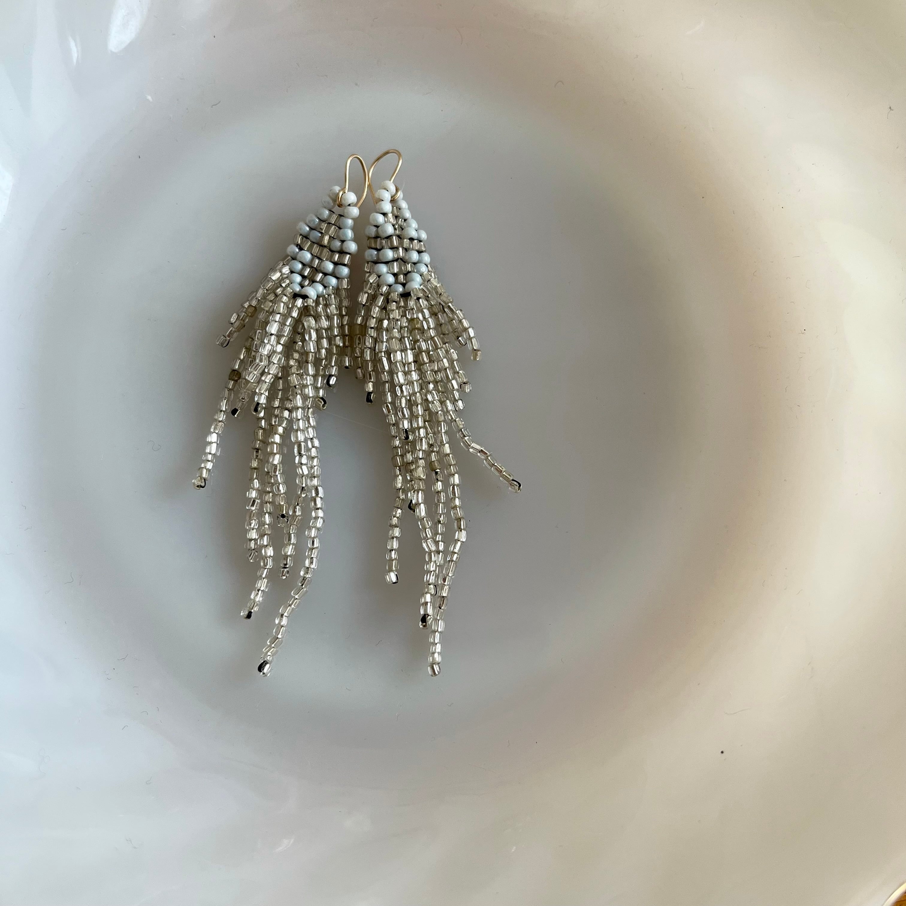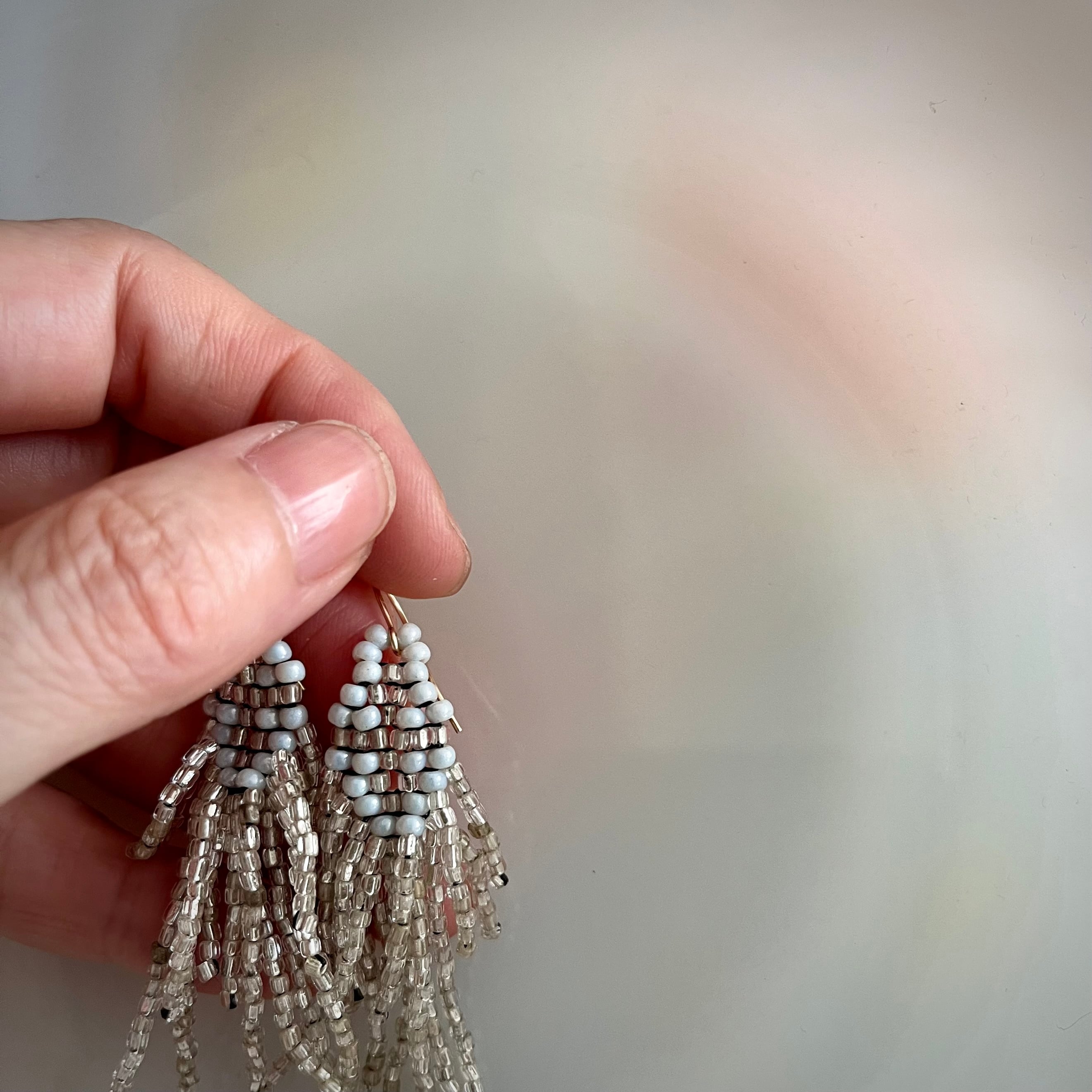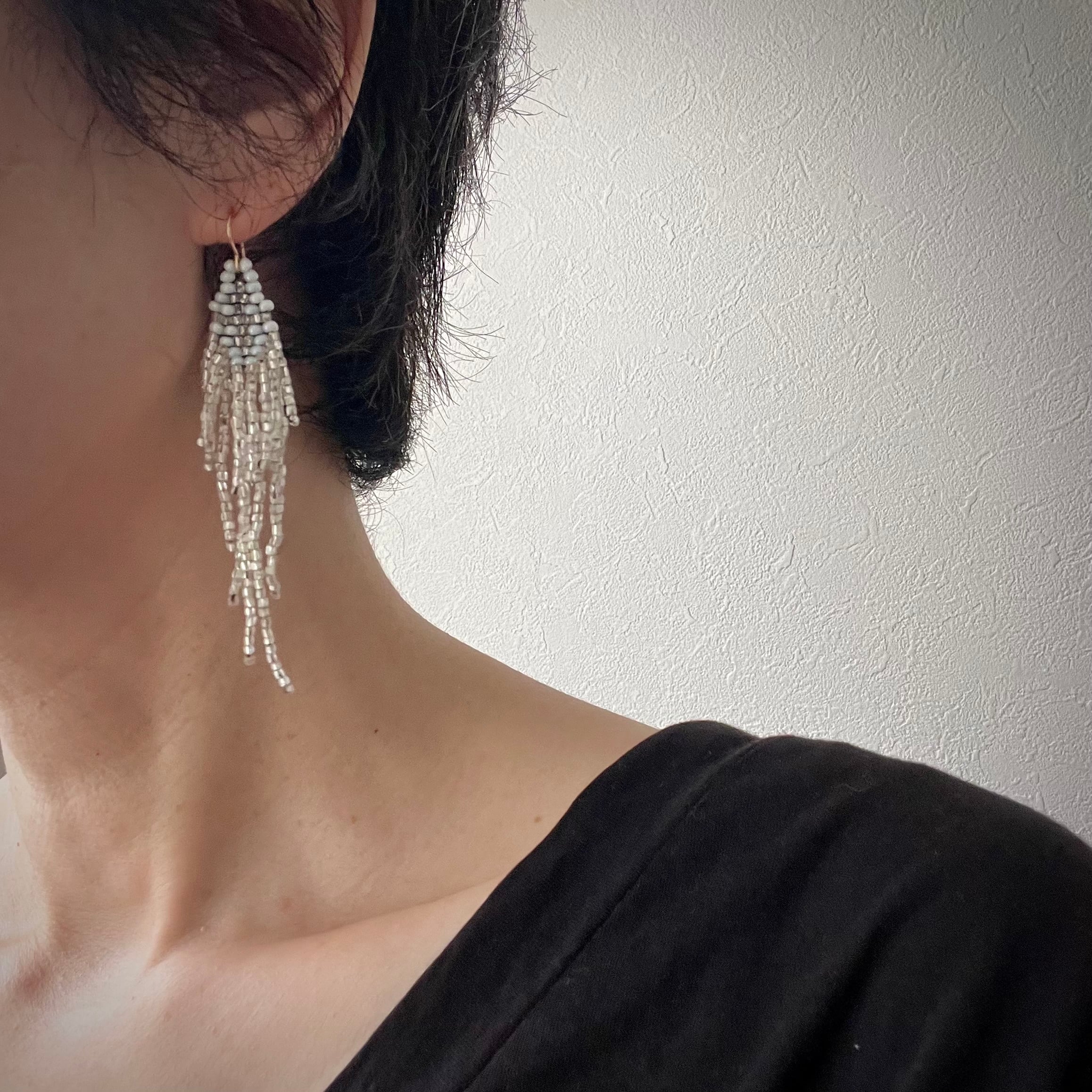 グレイがかったパールホワイトのビーズとシルバーカラーの組み合わせはシックで上品な雰囲気を醸し出しています。