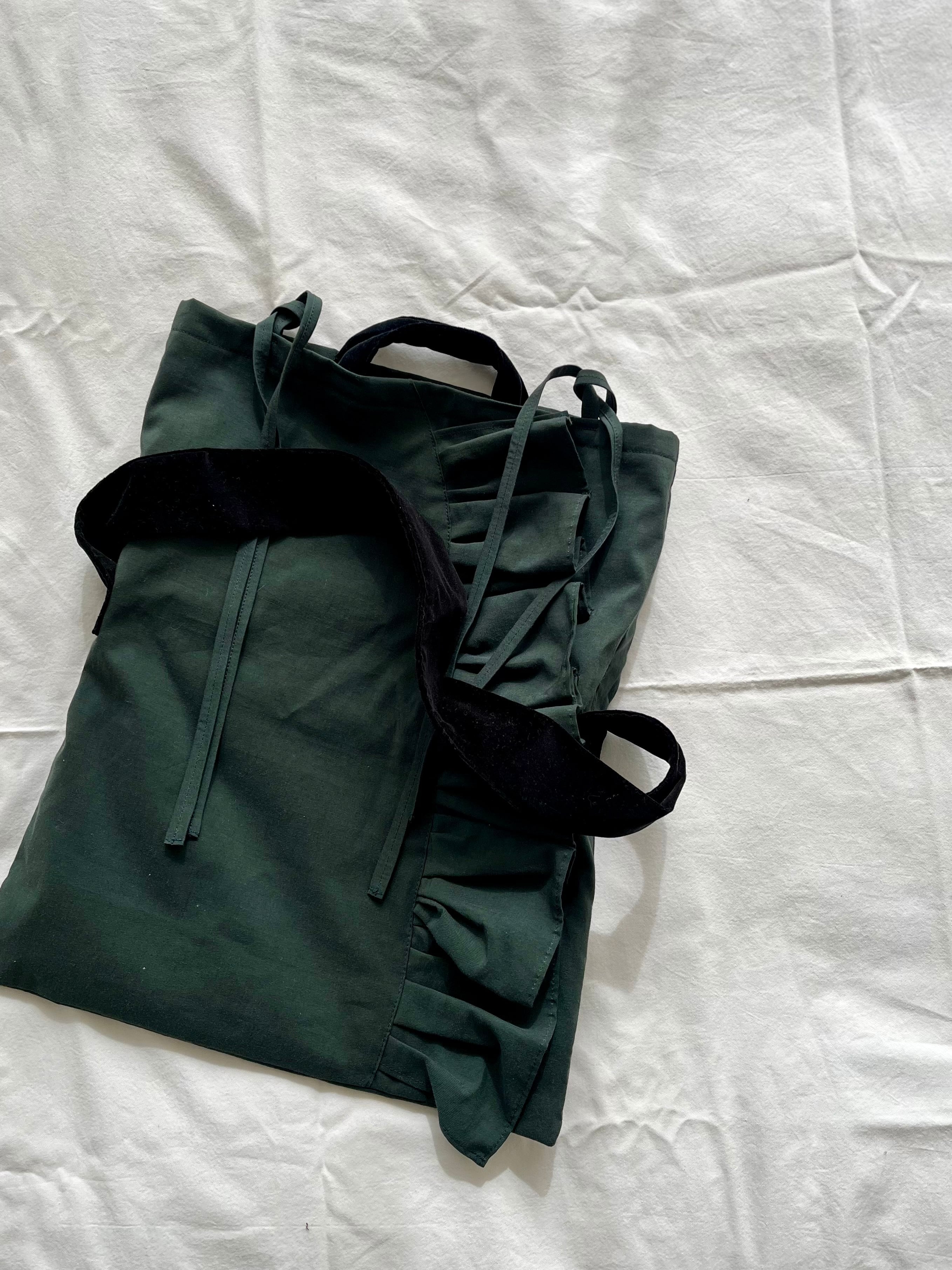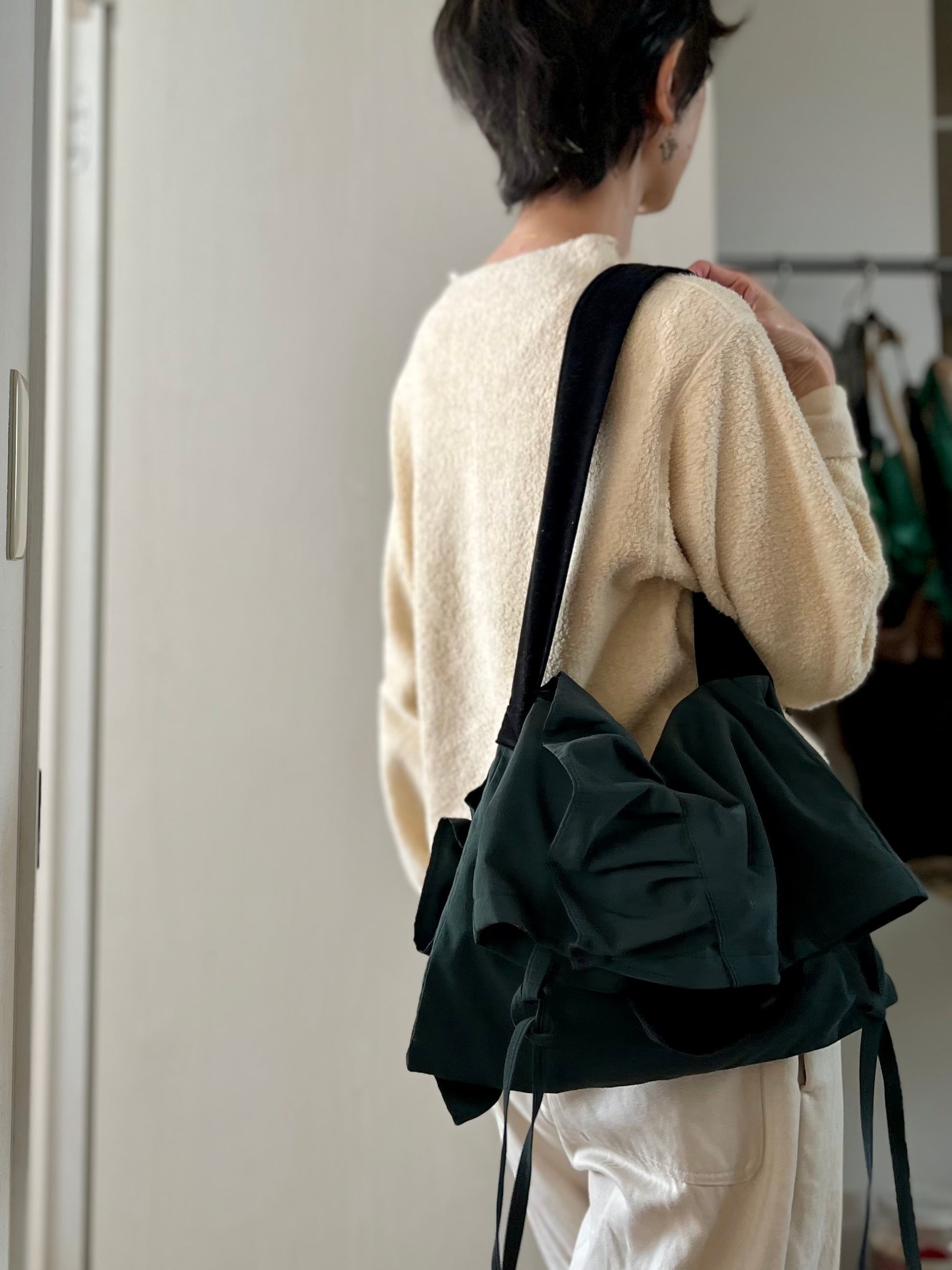 カーブしたフリルのラインがかわいい縦型トートバッグです。