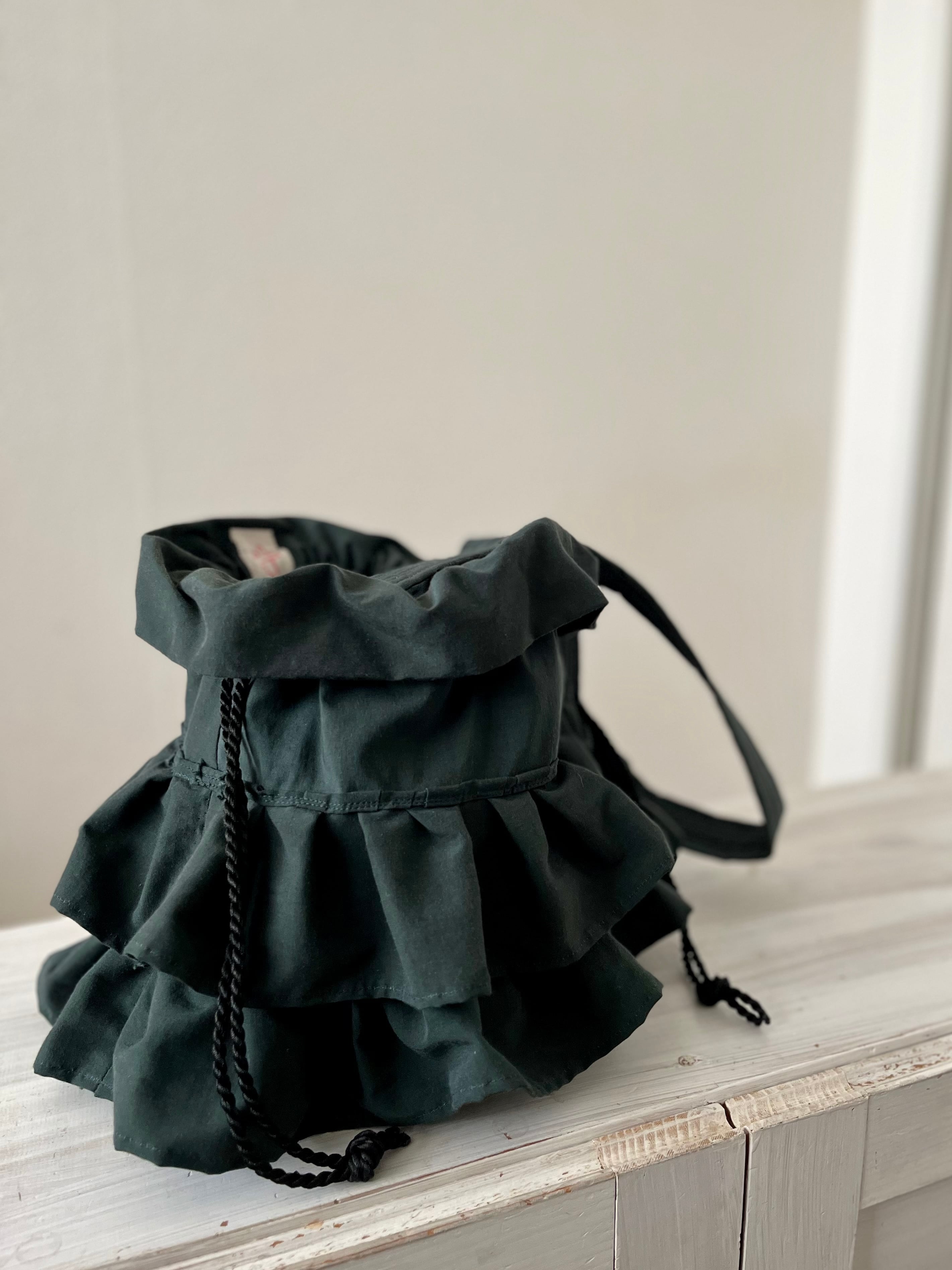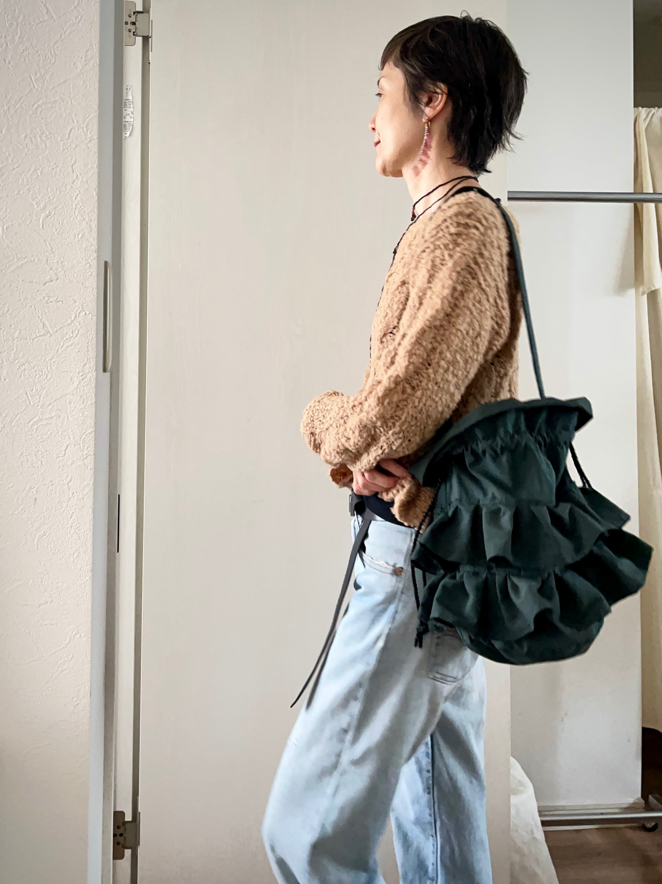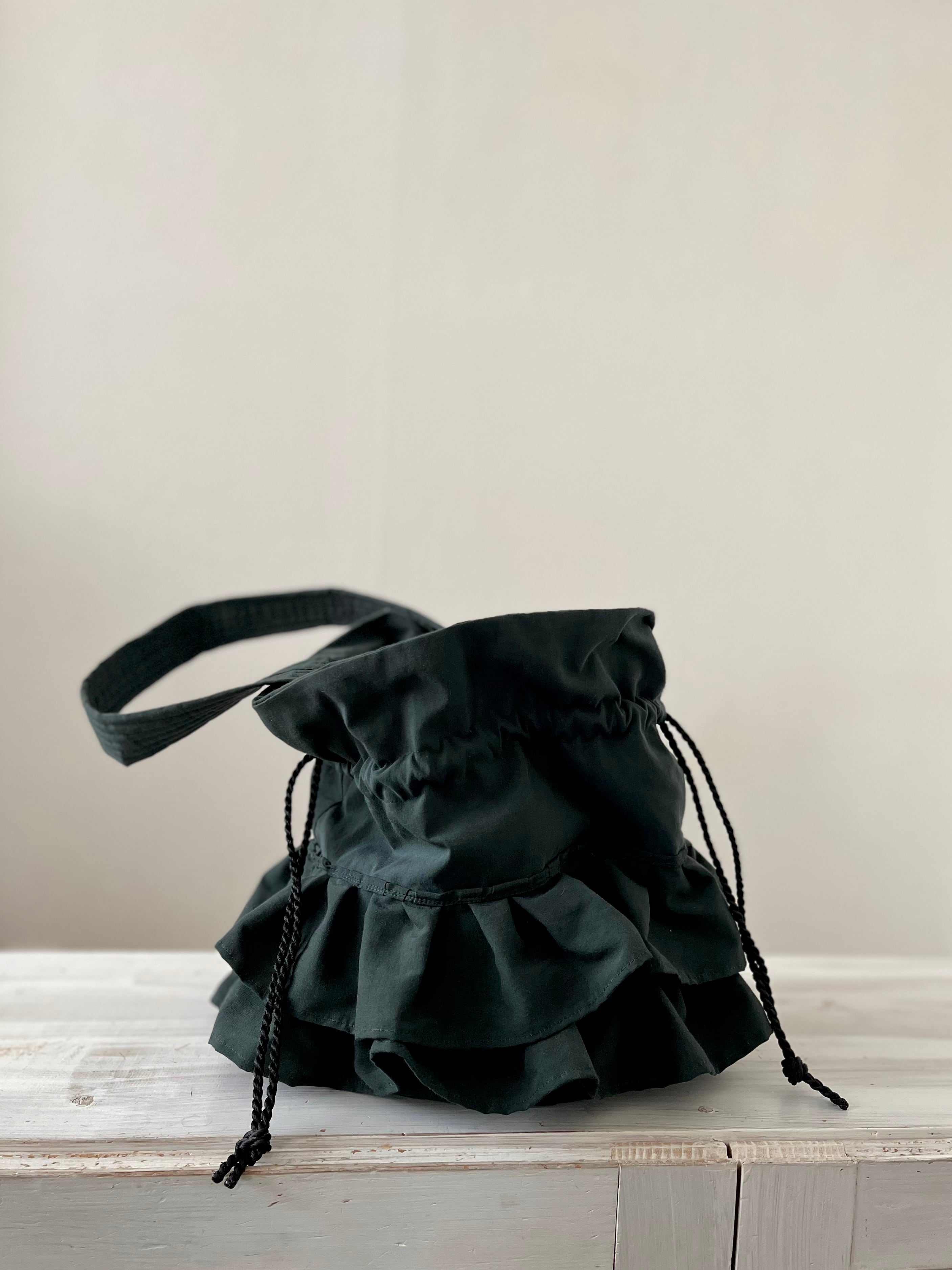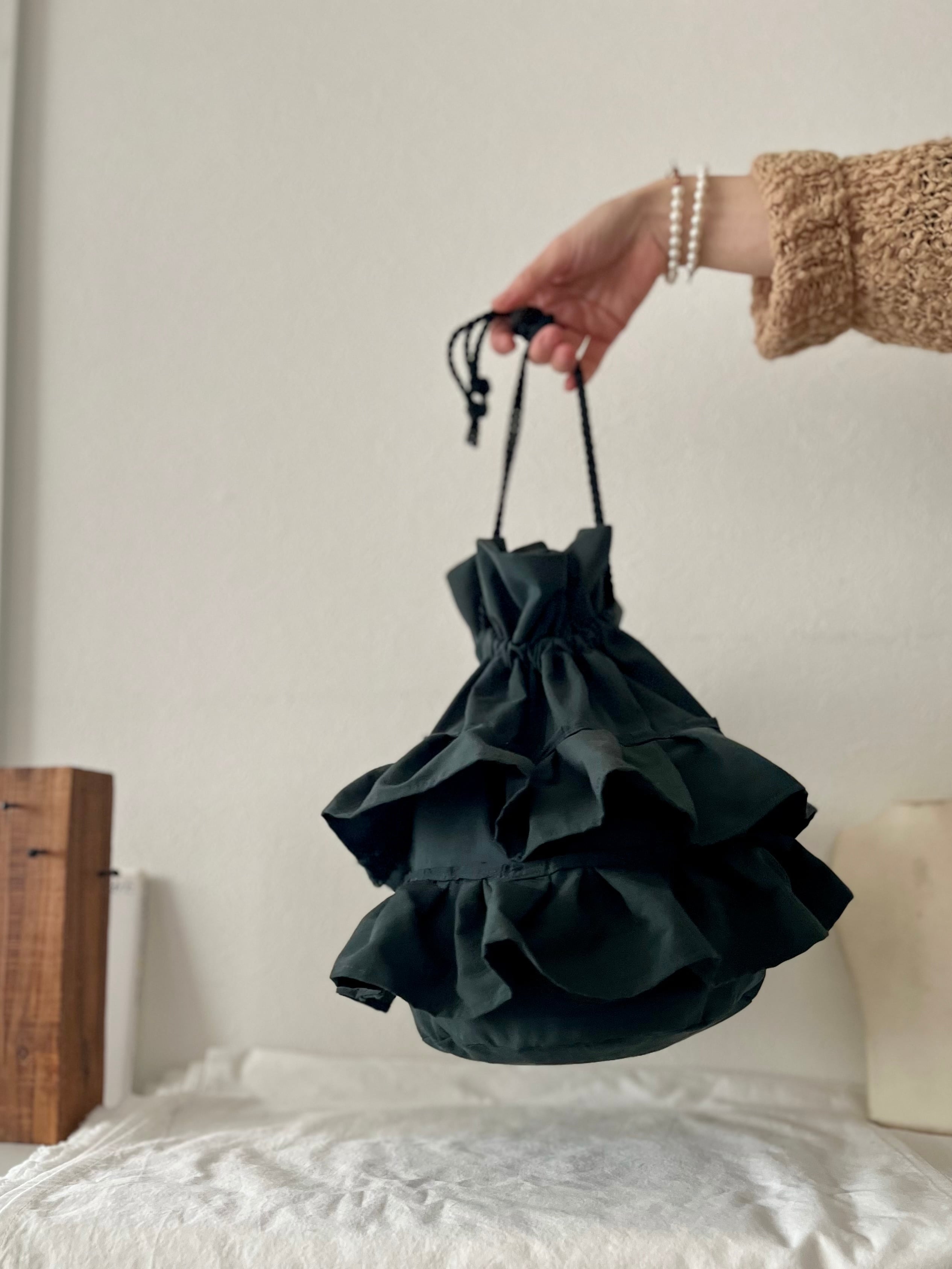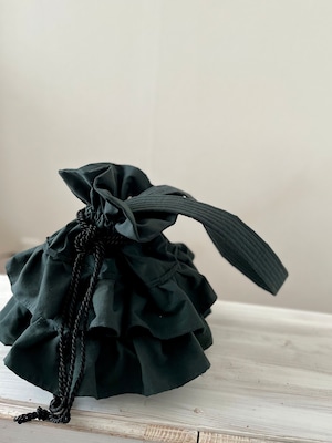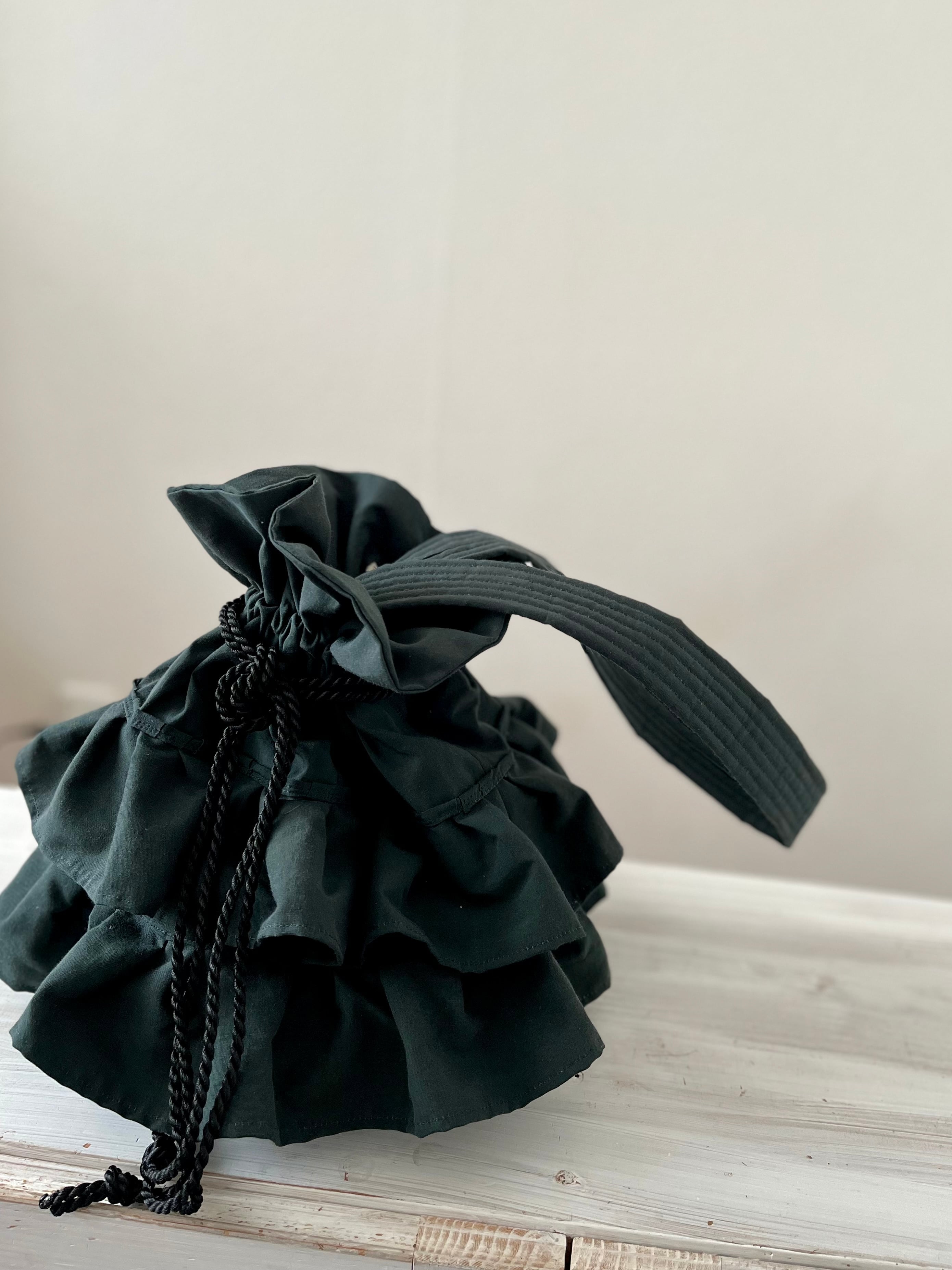 2段フリルがボリューミーにぐるっと取り囲む巾着バッグは大人の女性にぴったりのシックな可愛らしさ。