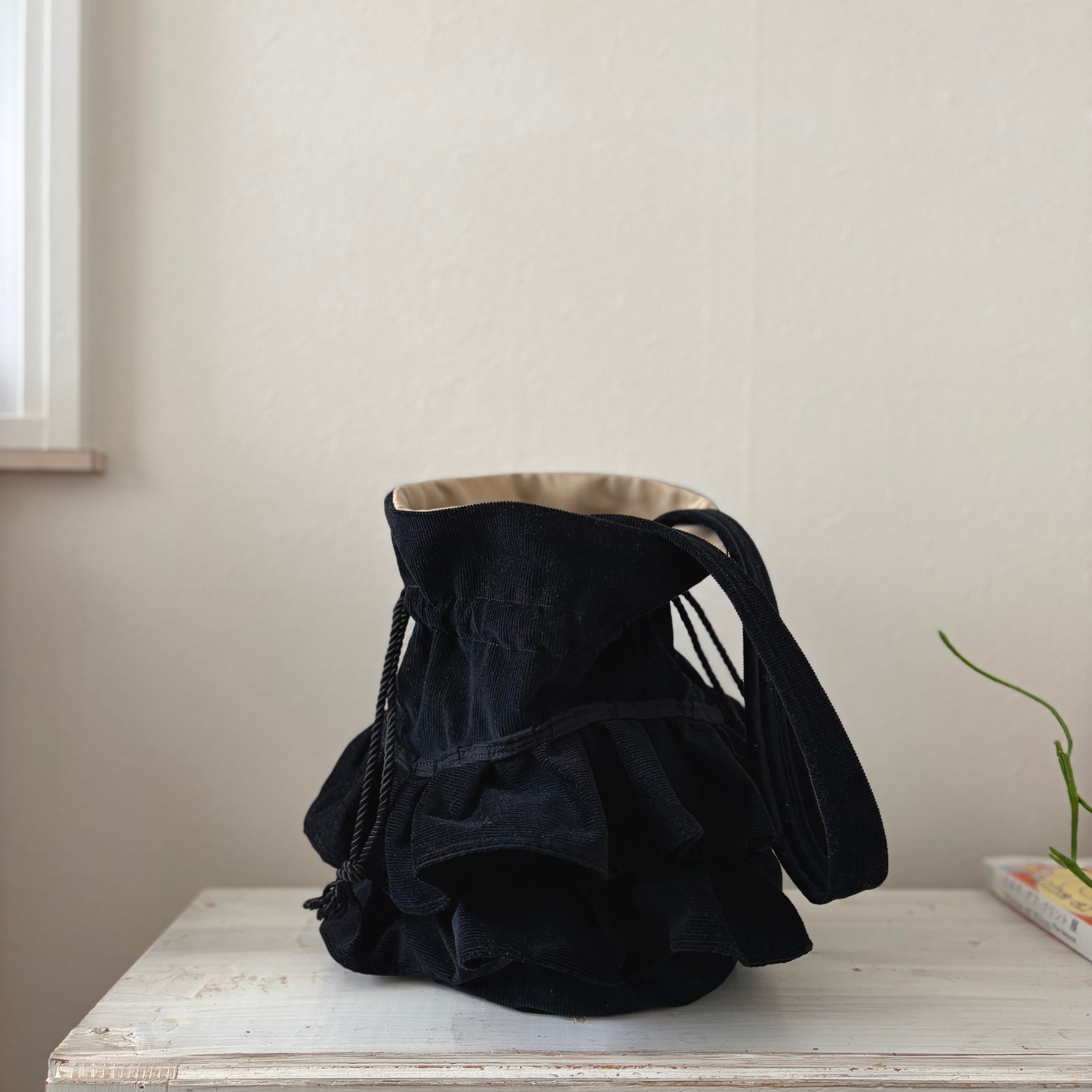 frill drawstring bag #black corduroy
