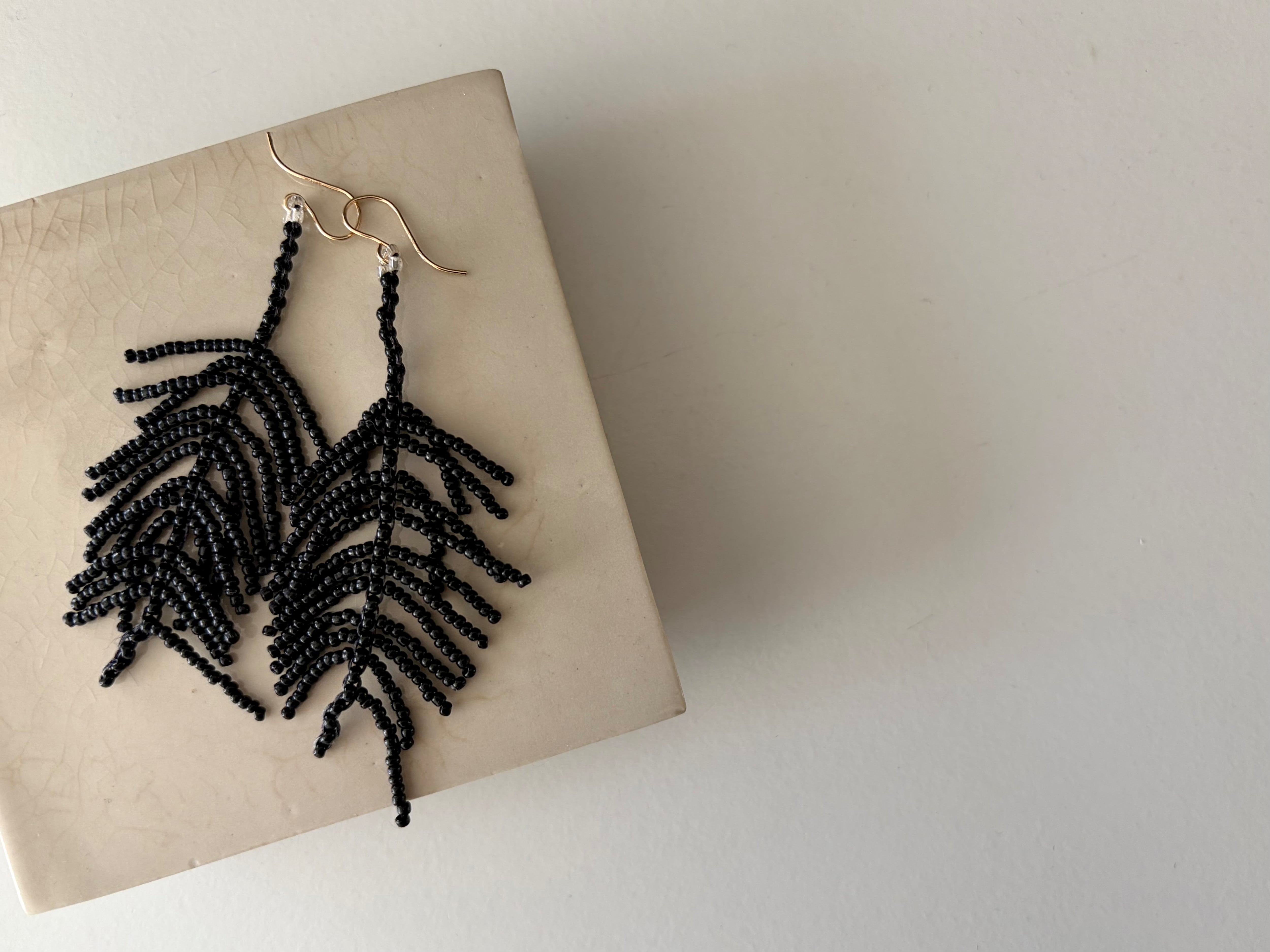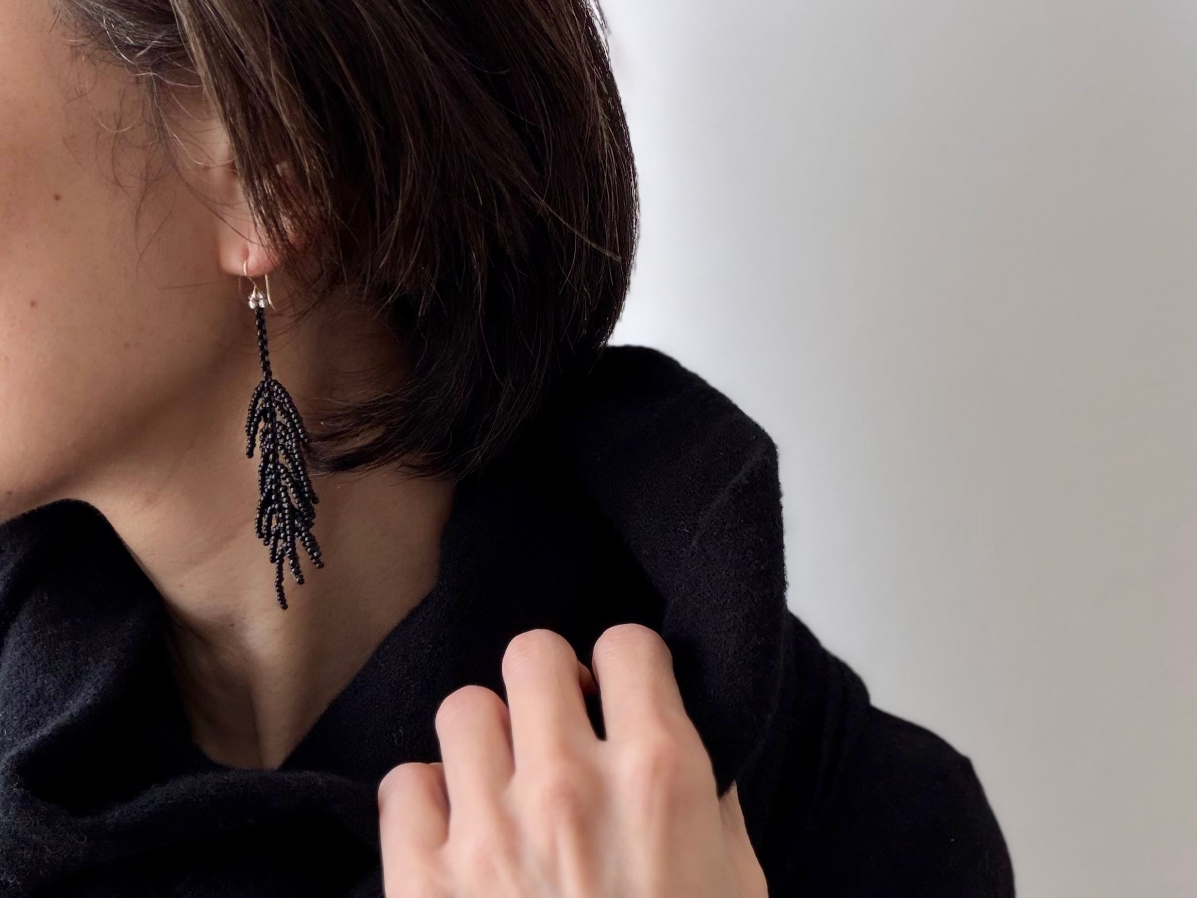 ブラックビーズがファサッと耳元で揺れ動く、個性的でエッジのあるピアスです。