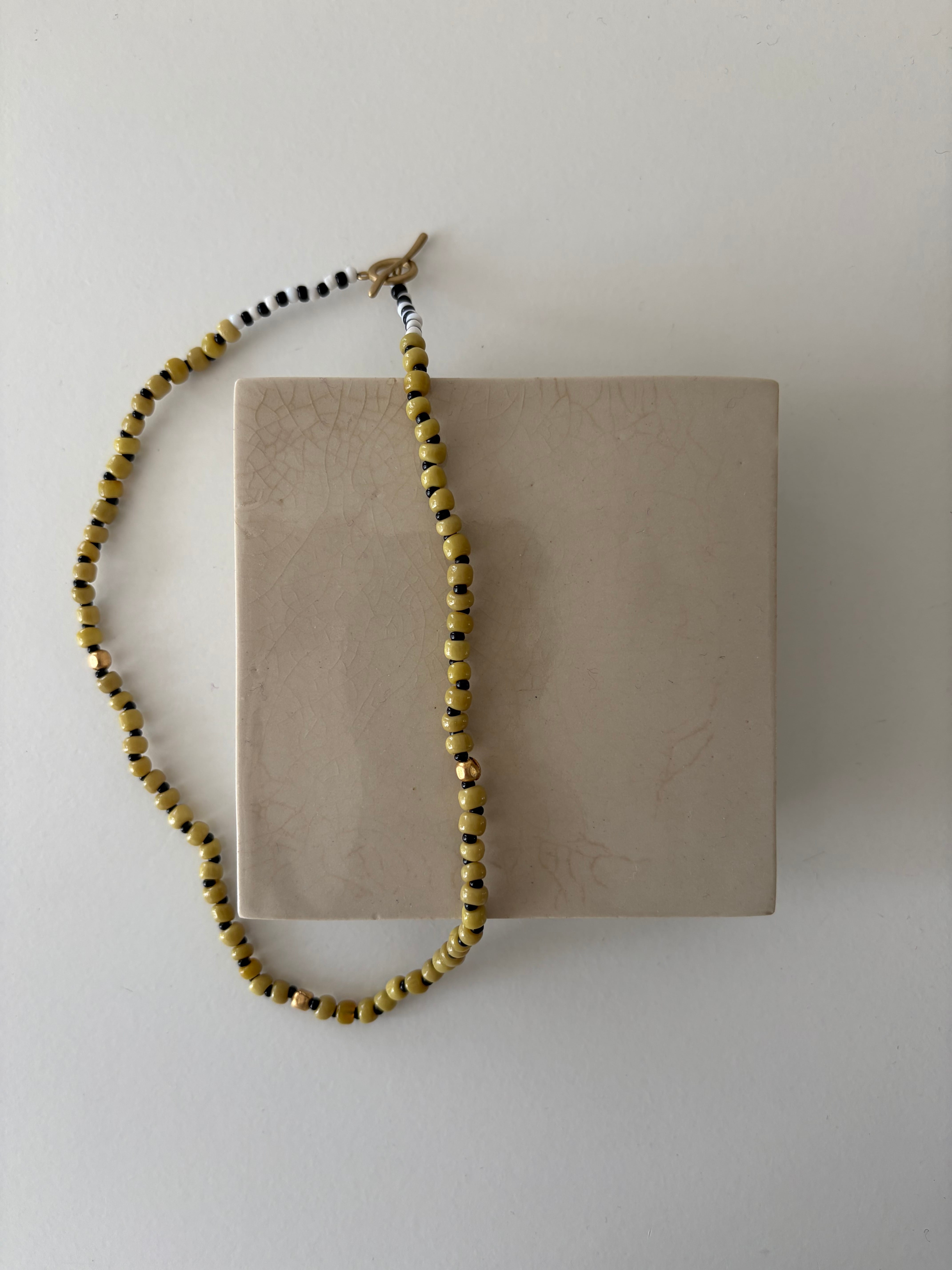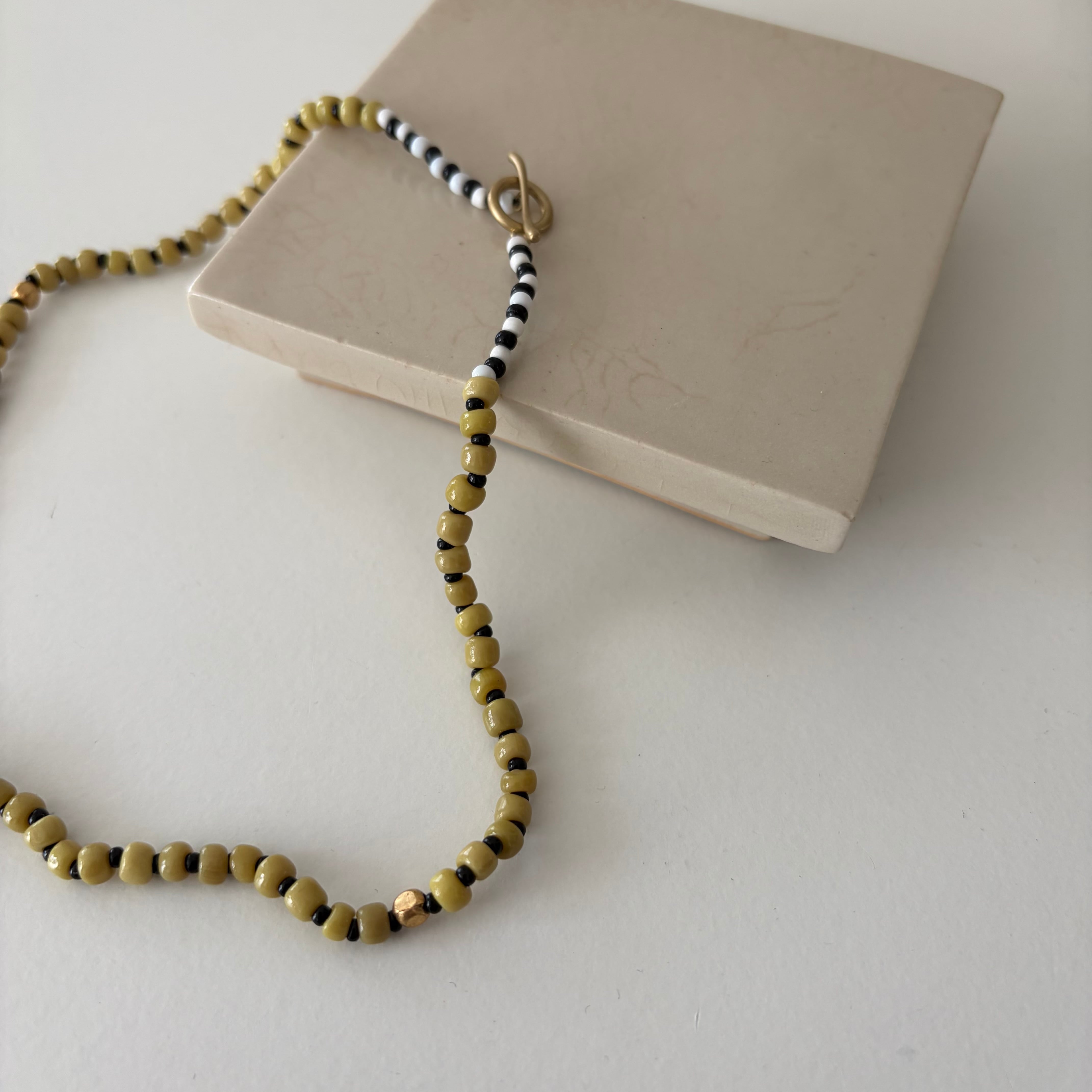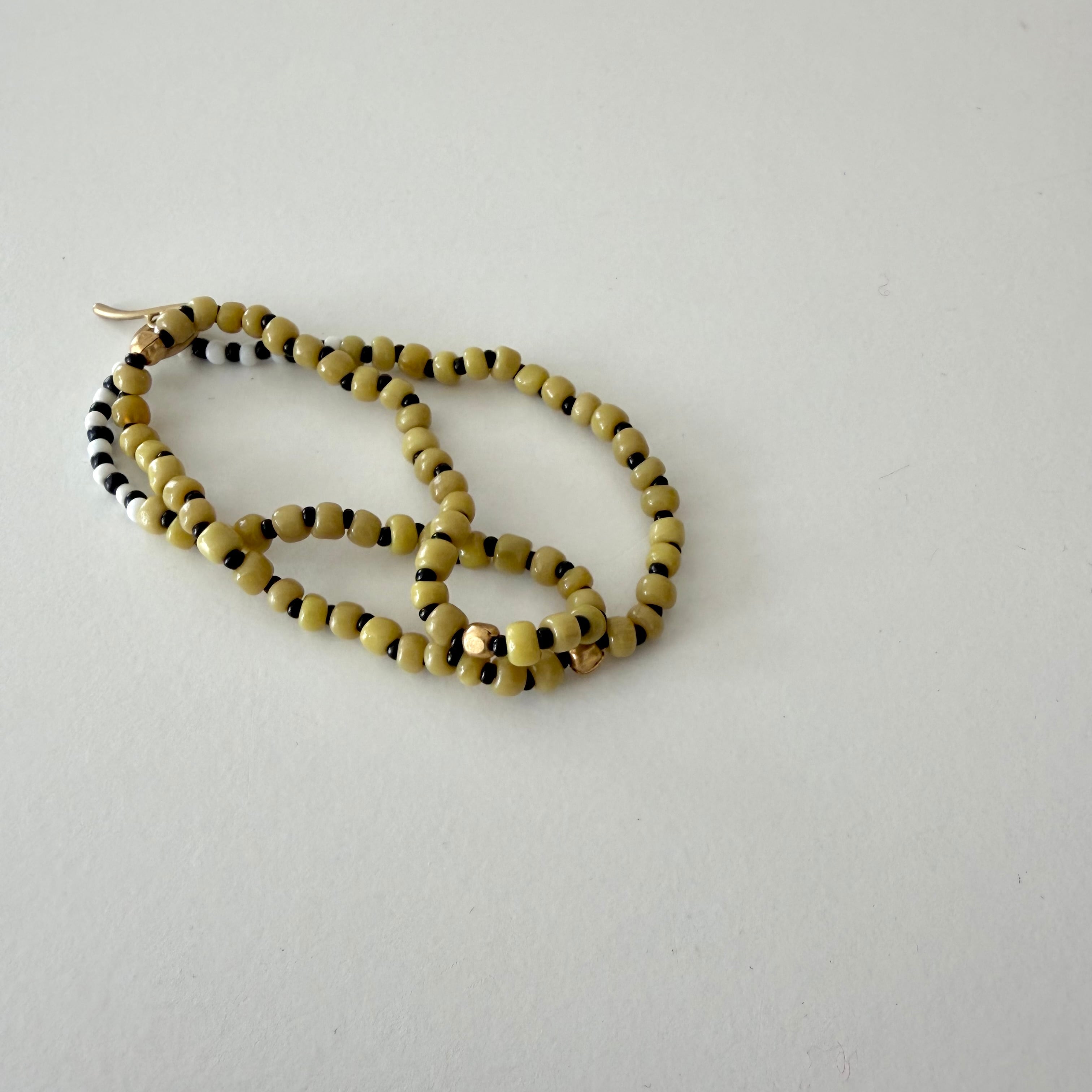 ビーズの不揃いな形と微かな色の濃淡が、肌の一部のように馴染んでくれます。