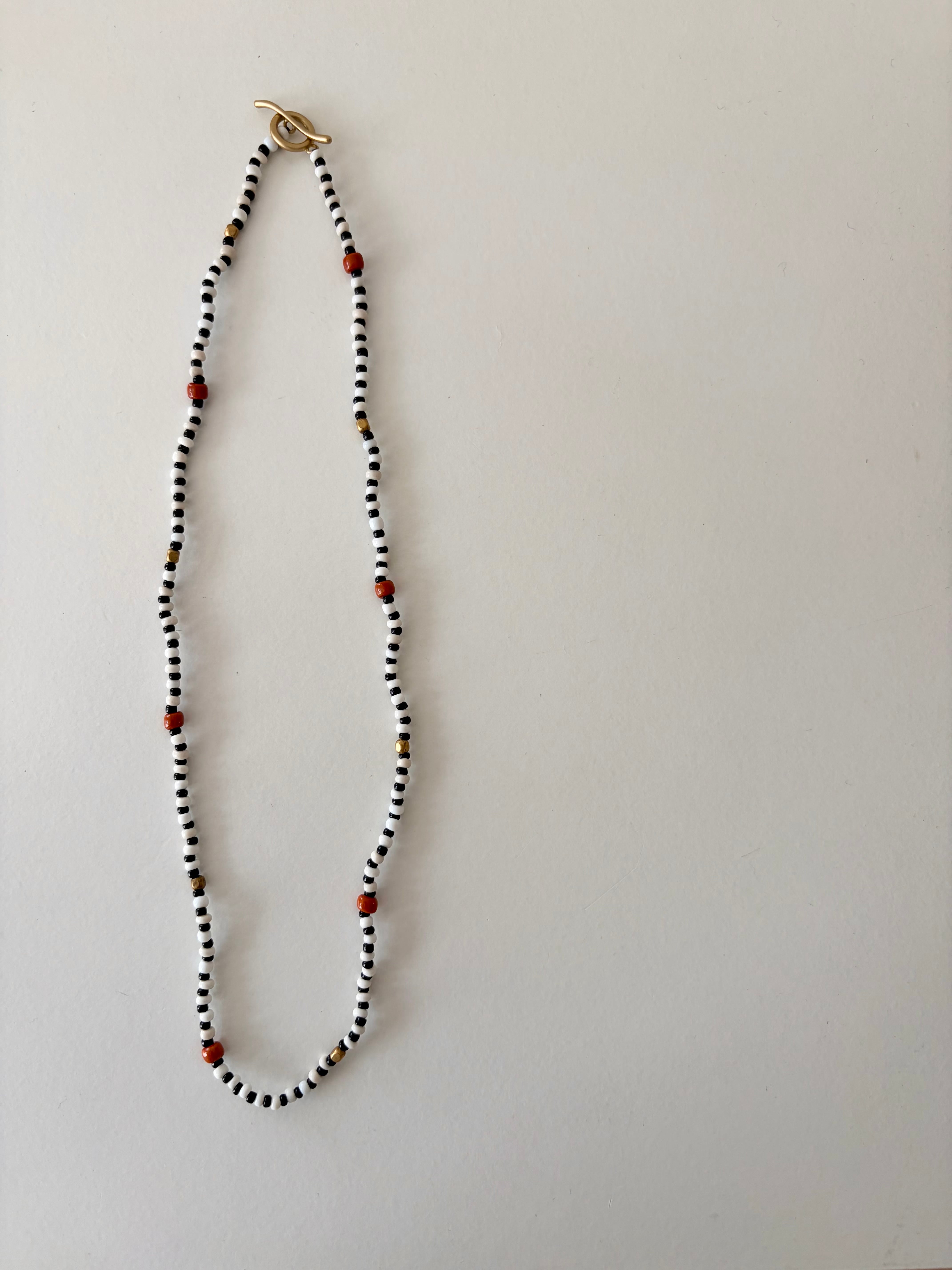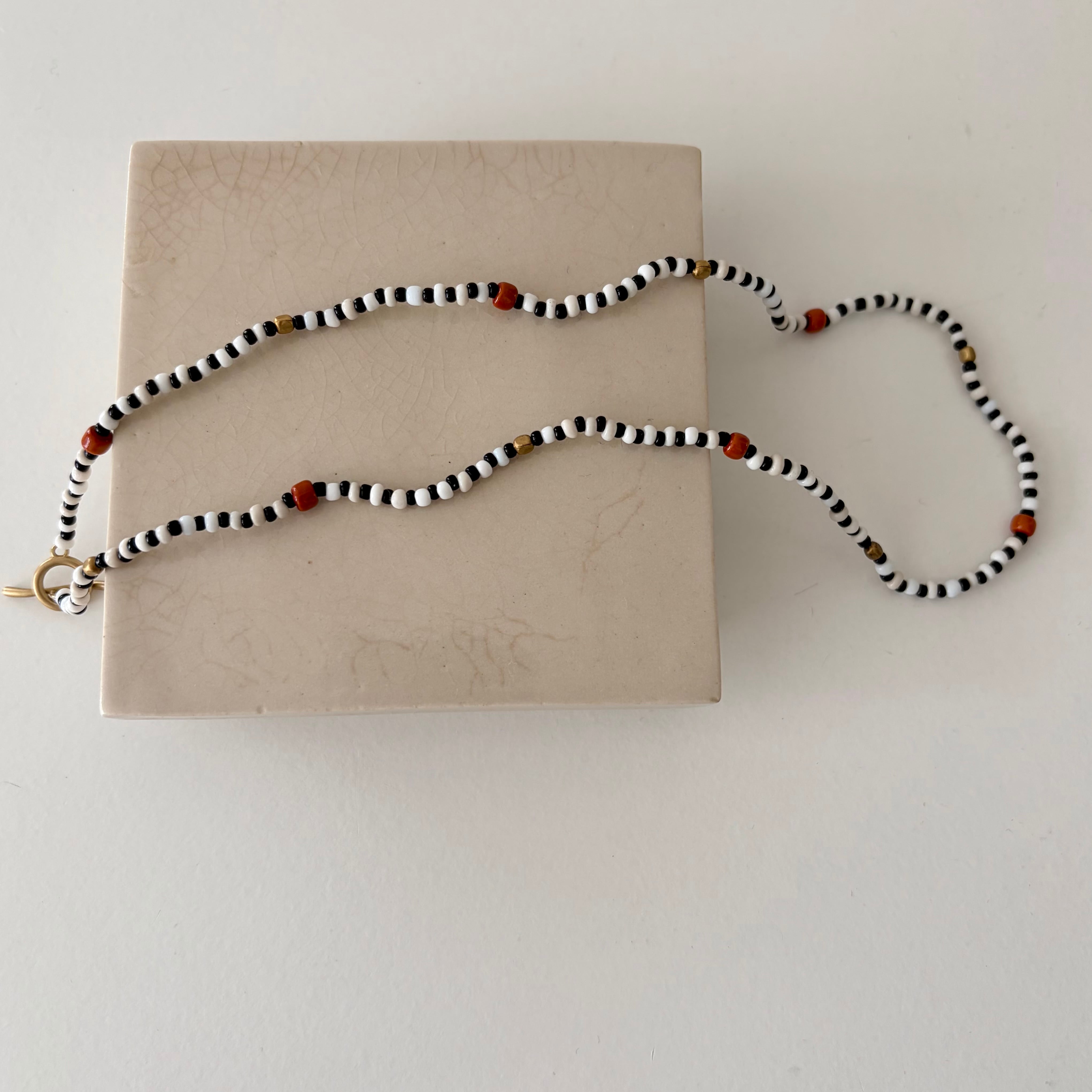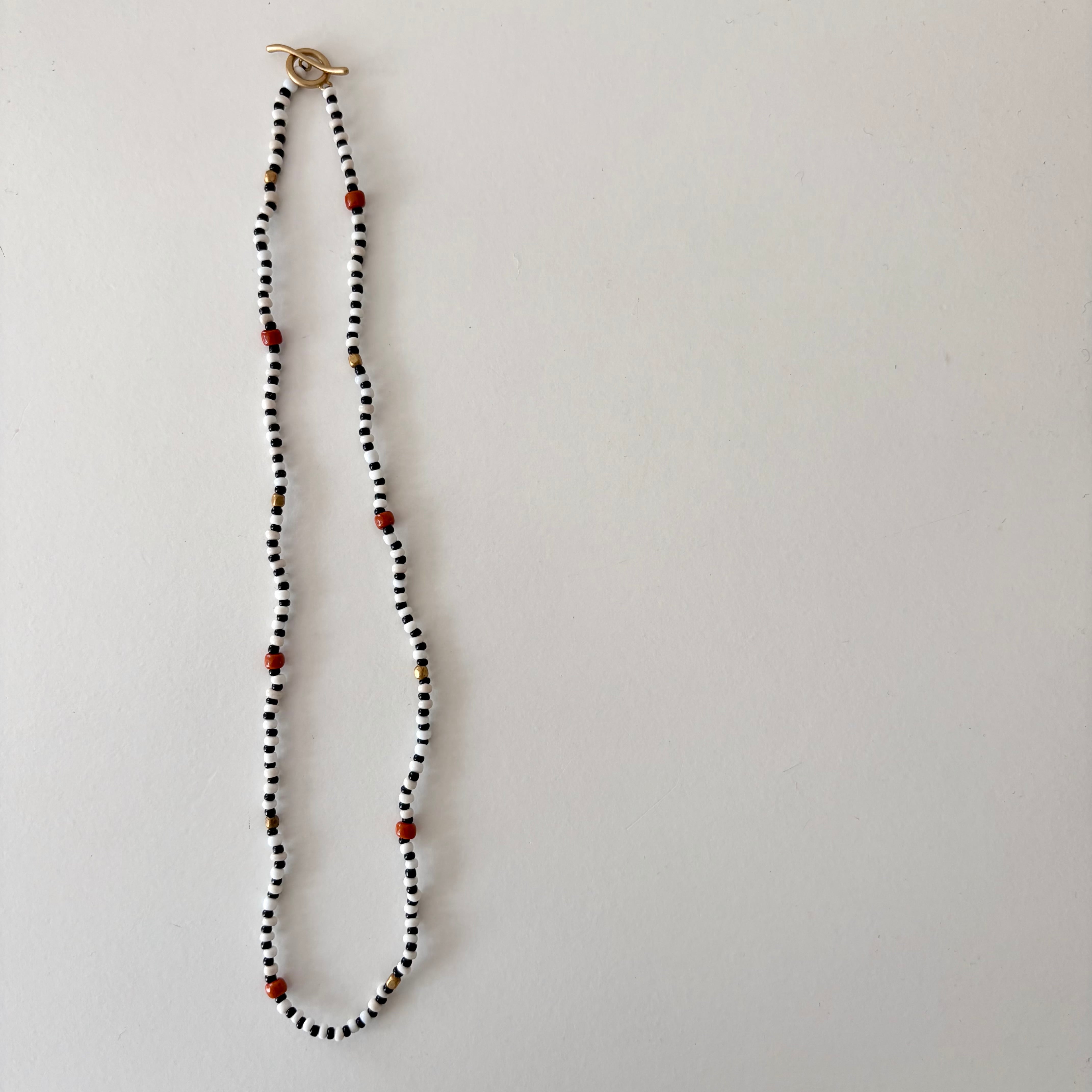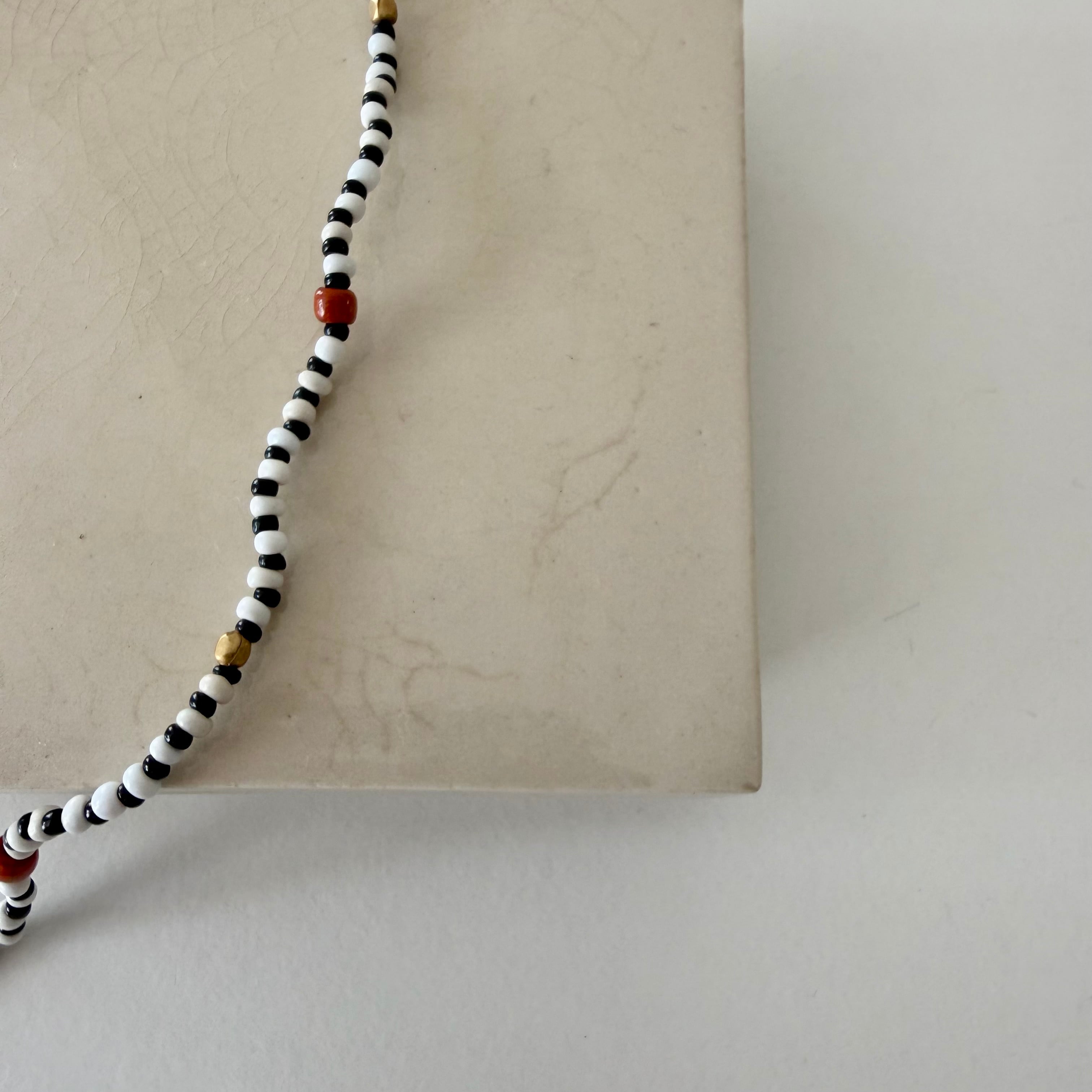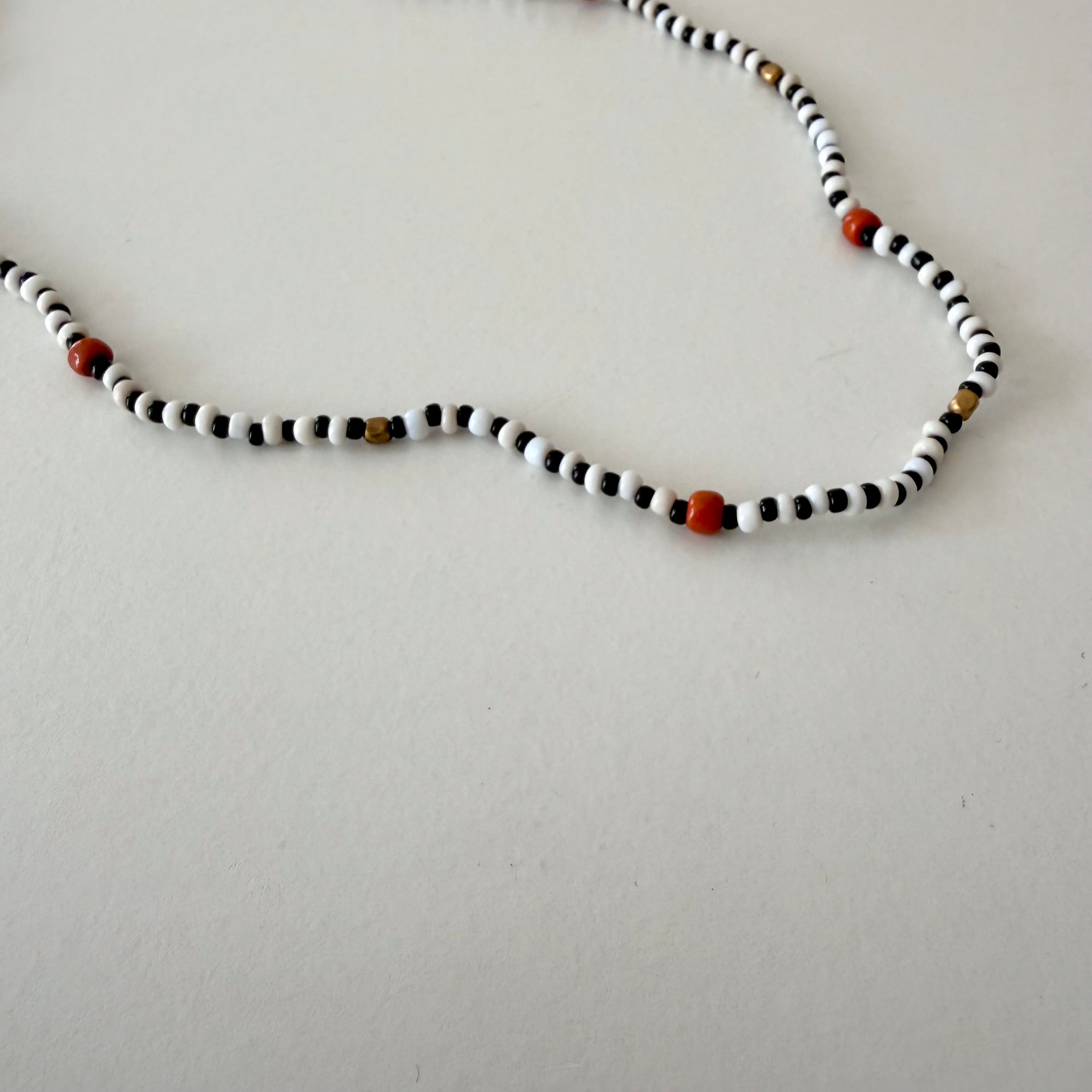 白黒のビーズとダークオレンジのコントラストが知的でチャーミングなネックレス。