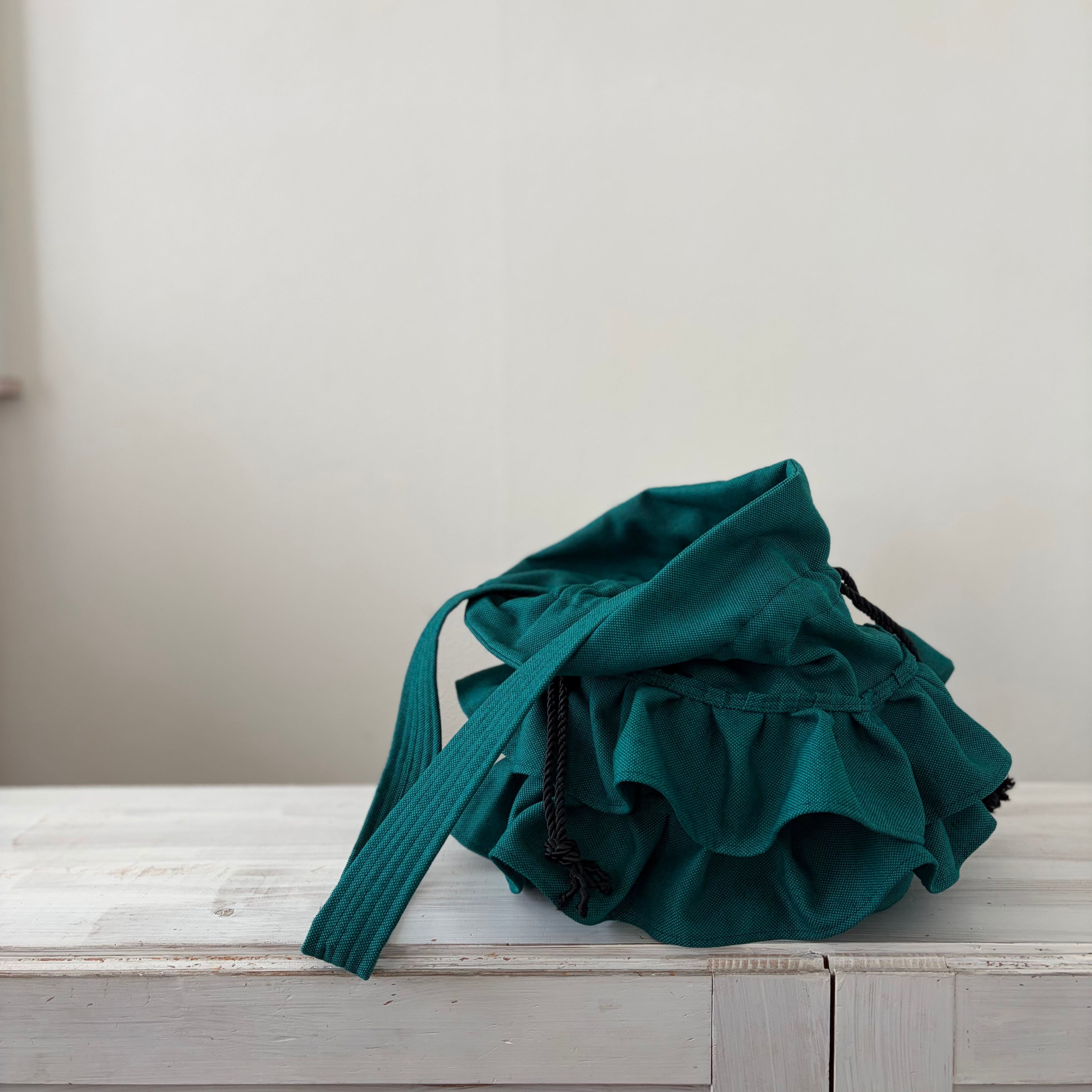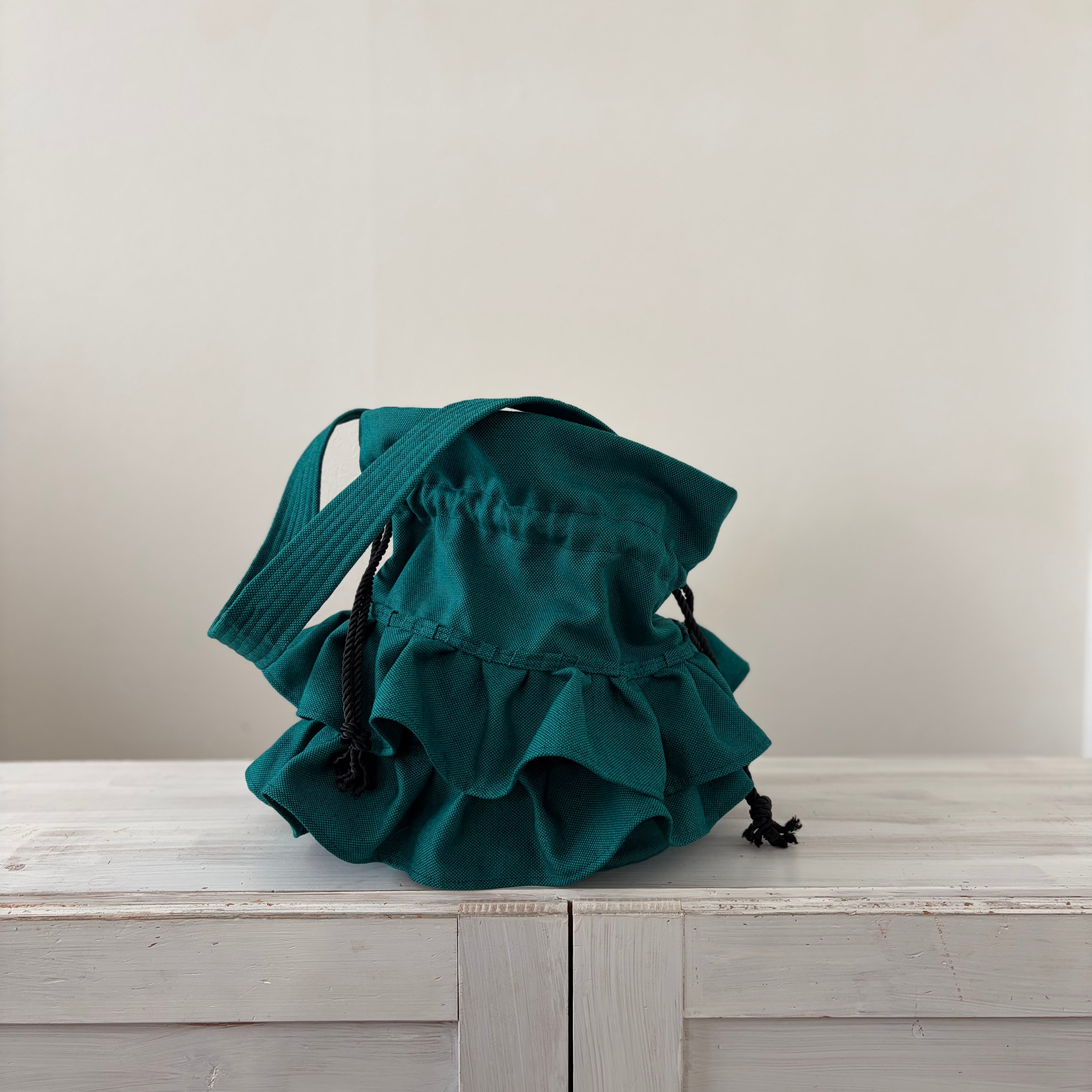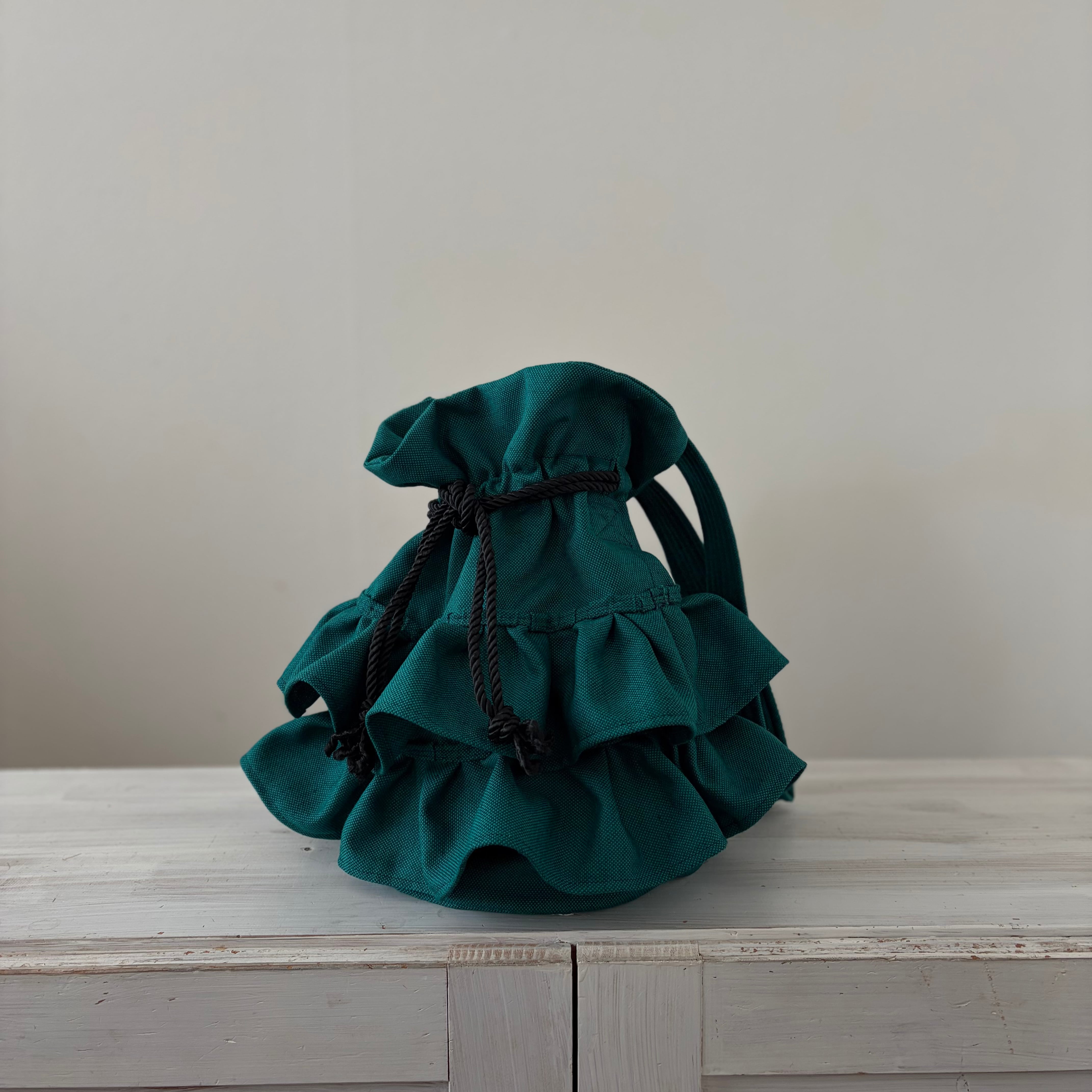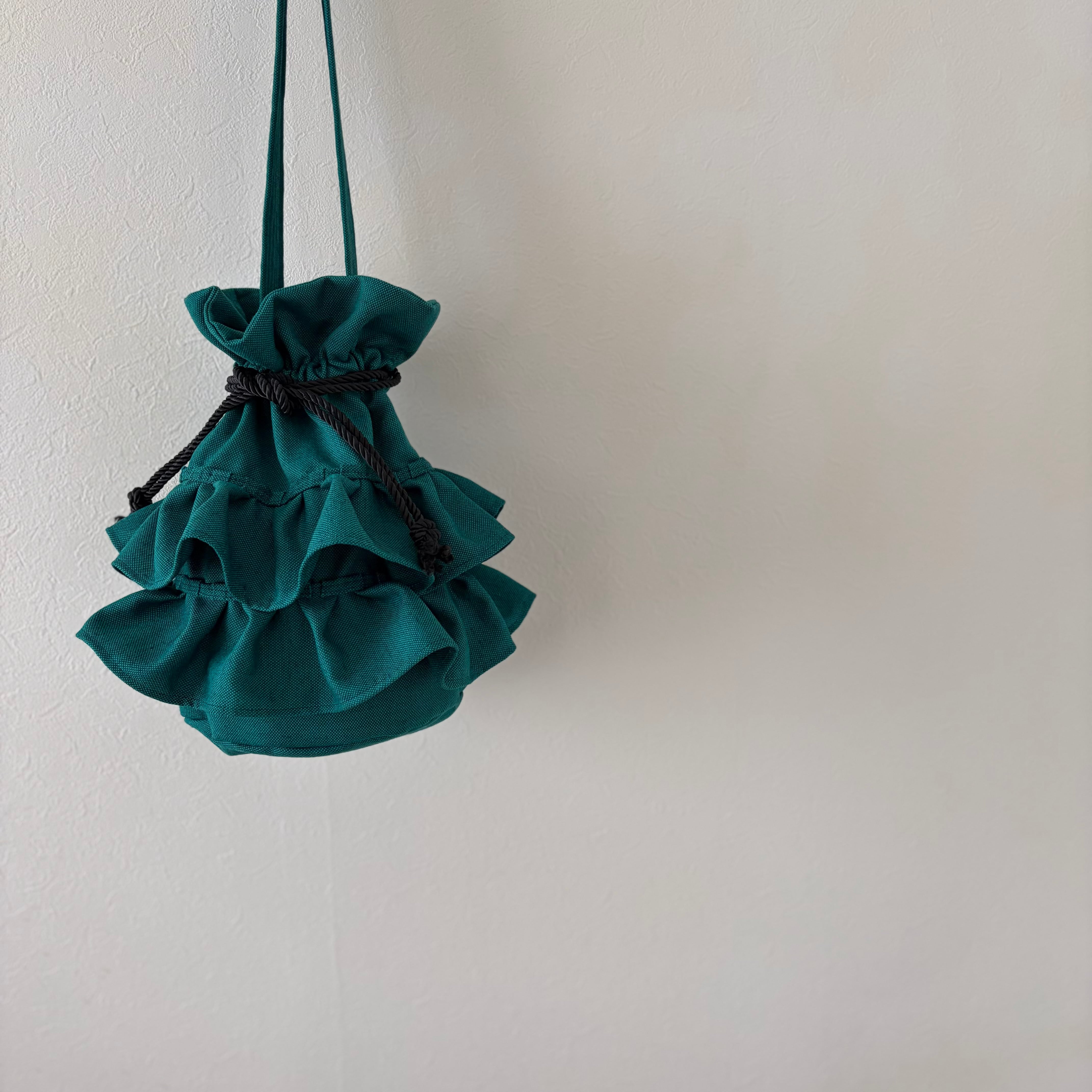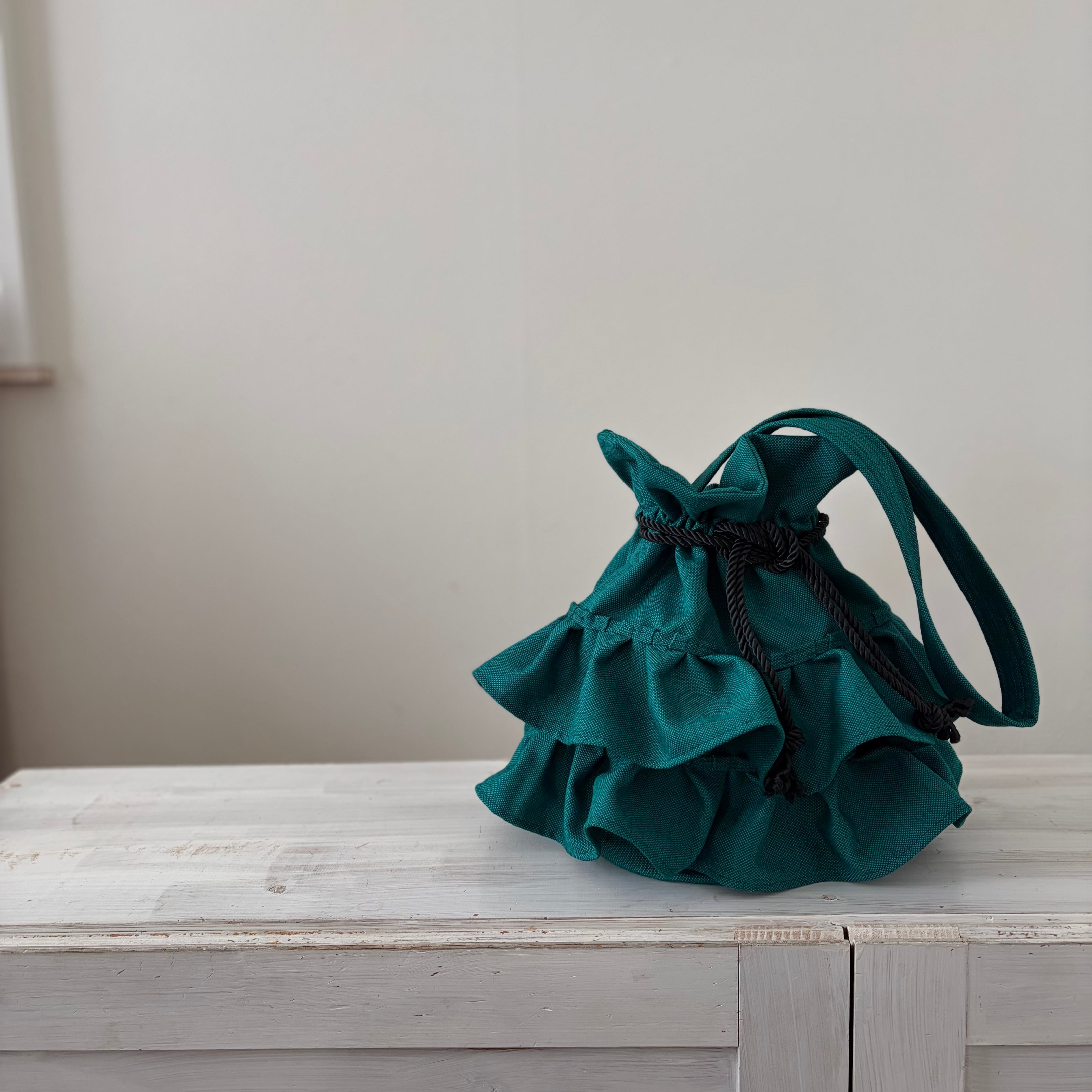 2段フリルがボリューミーにぐるっと取り囲む丸底の巾着バッグは大人の女性にぴったりのシックな可愛らしさ。